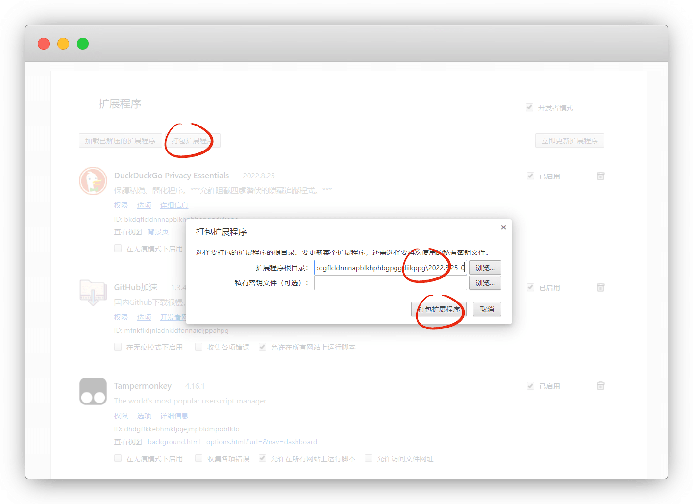 地址复制出来,点击 打包扩展程序,把地址粘贴进去,打包即可
