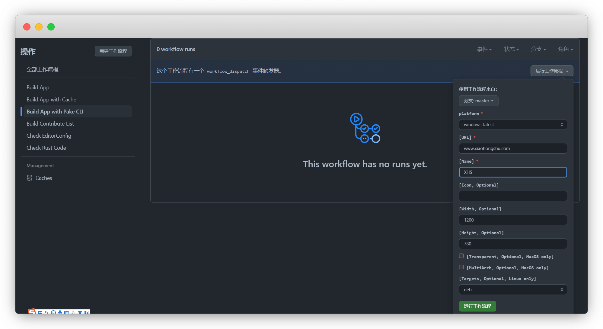 选择 Build App with Pake CLI ,右侧信息除必填项,其他默认,最后运行Run