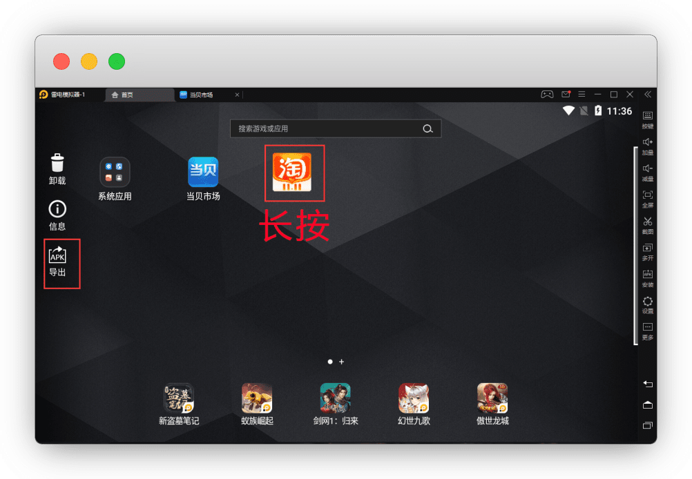 长按 电视淘宝 -别松手 拖拽至 右侧的 导出 上,松开