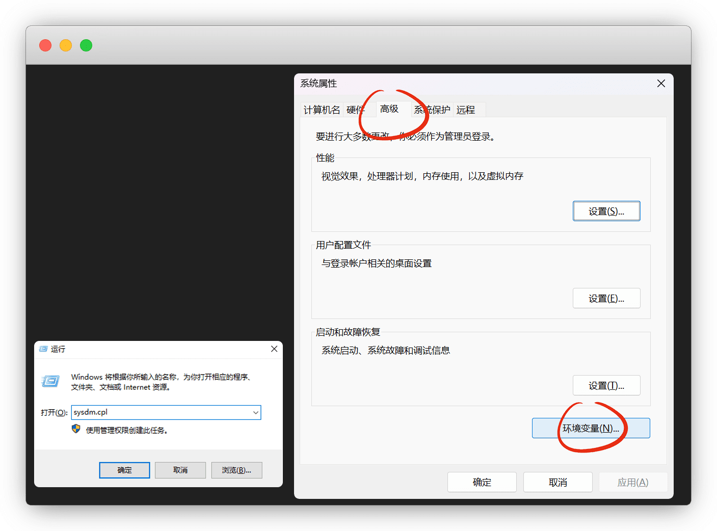 windows+R组合键,打开运行输入sysdm.cpl 回车,进入系统属性 - 高级 - 环境变量