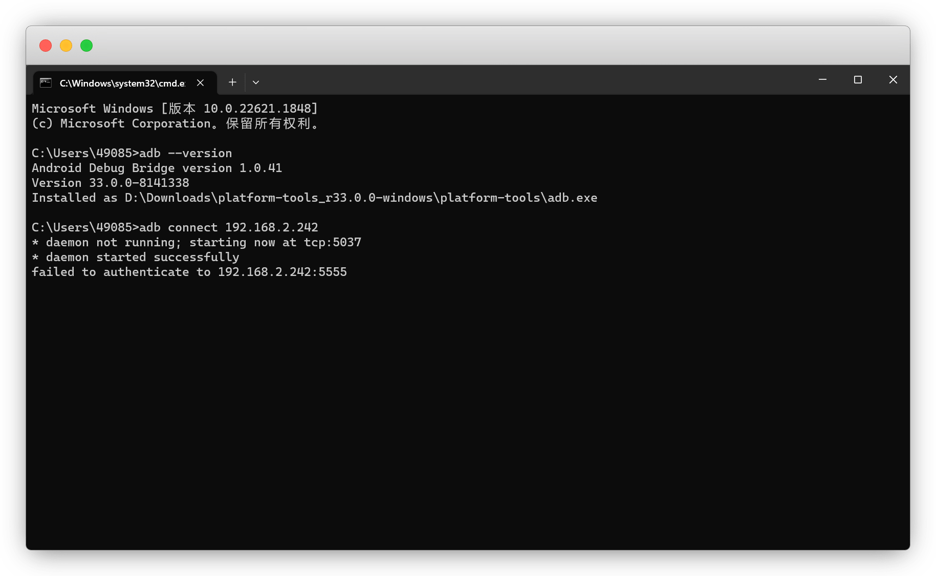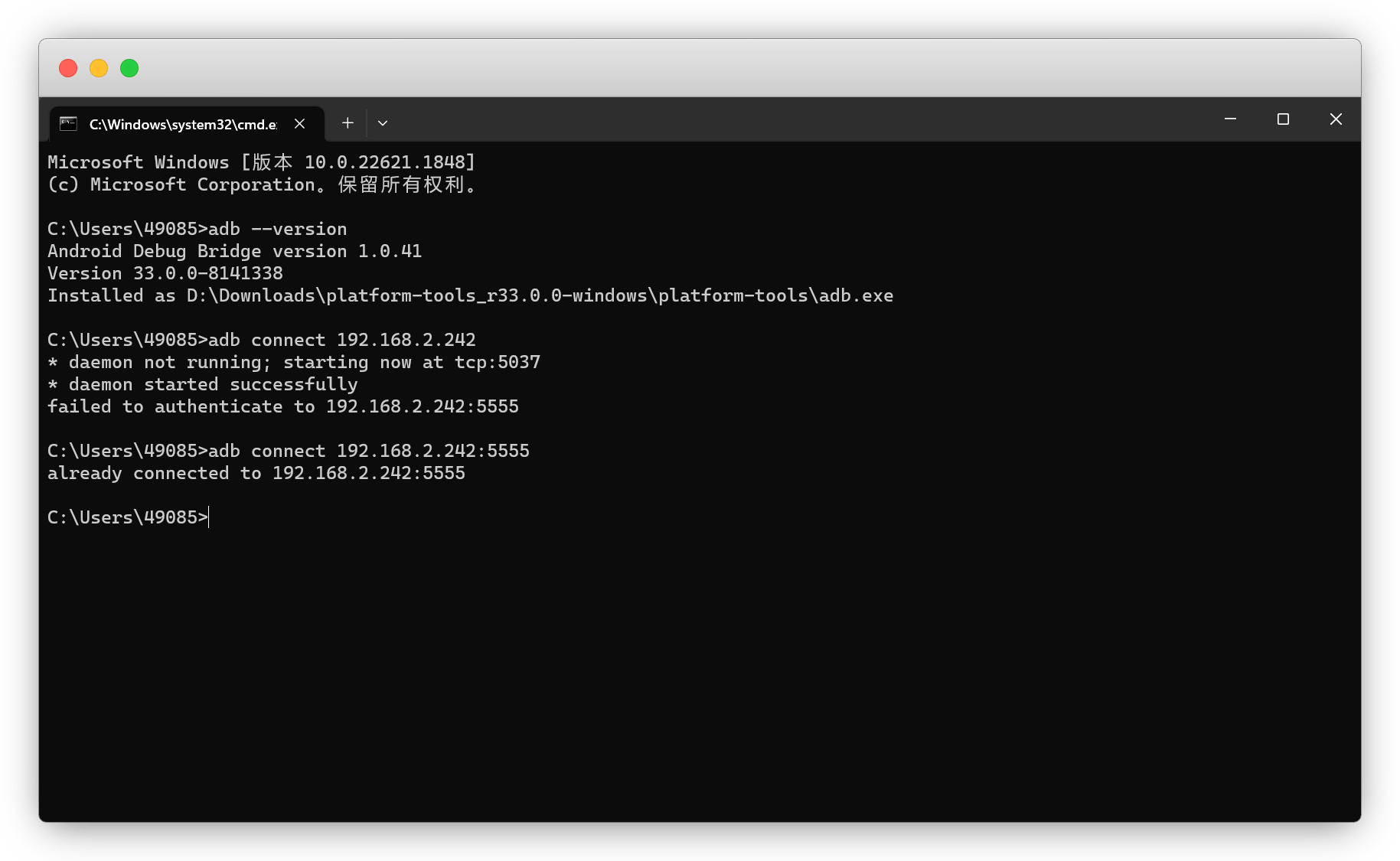 已连接成功会显示 already connected ,你也可以输入 adb devices 查看