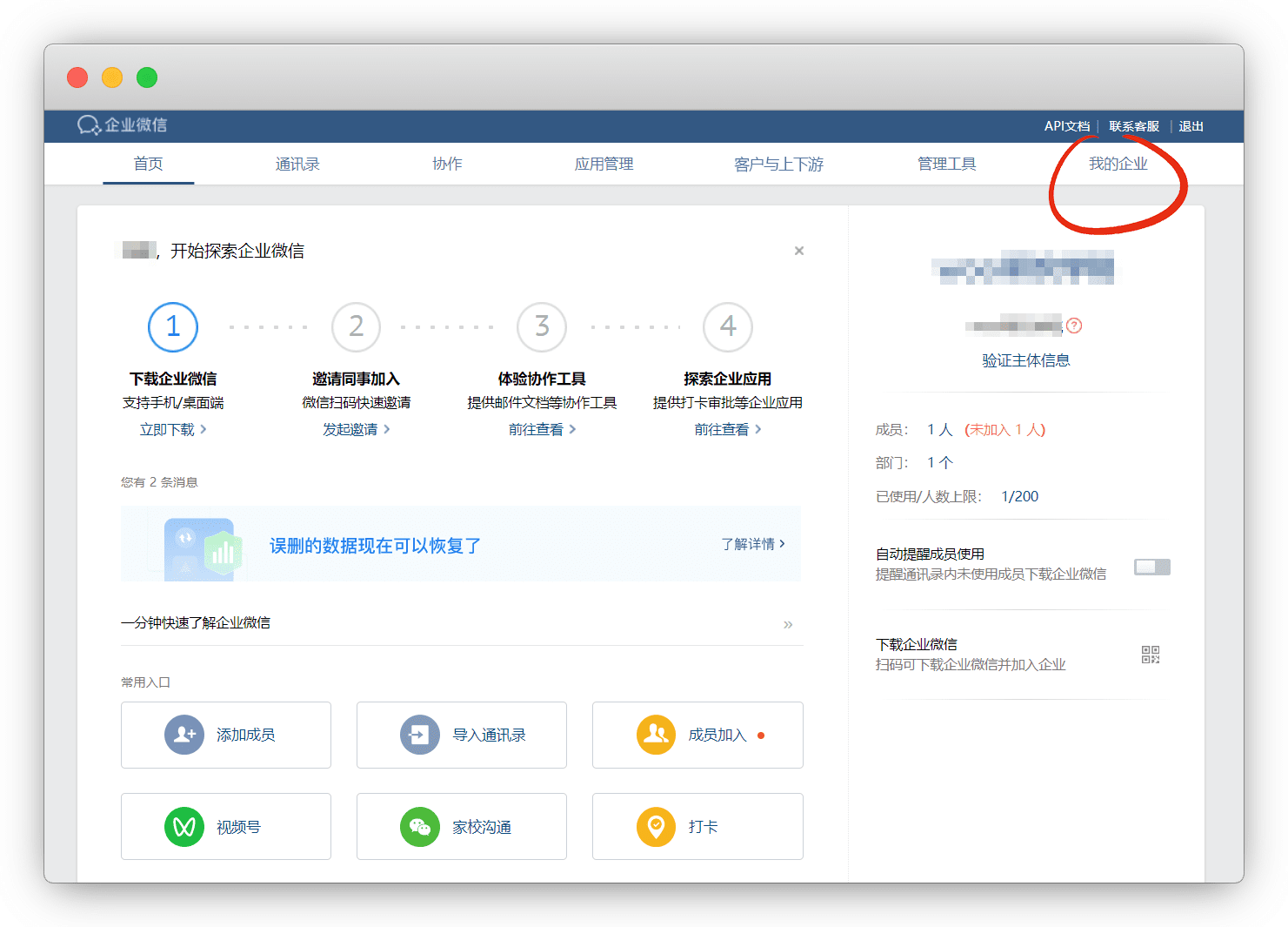 而且这里提示有1人未加入,我们下载企业微信app并登陆