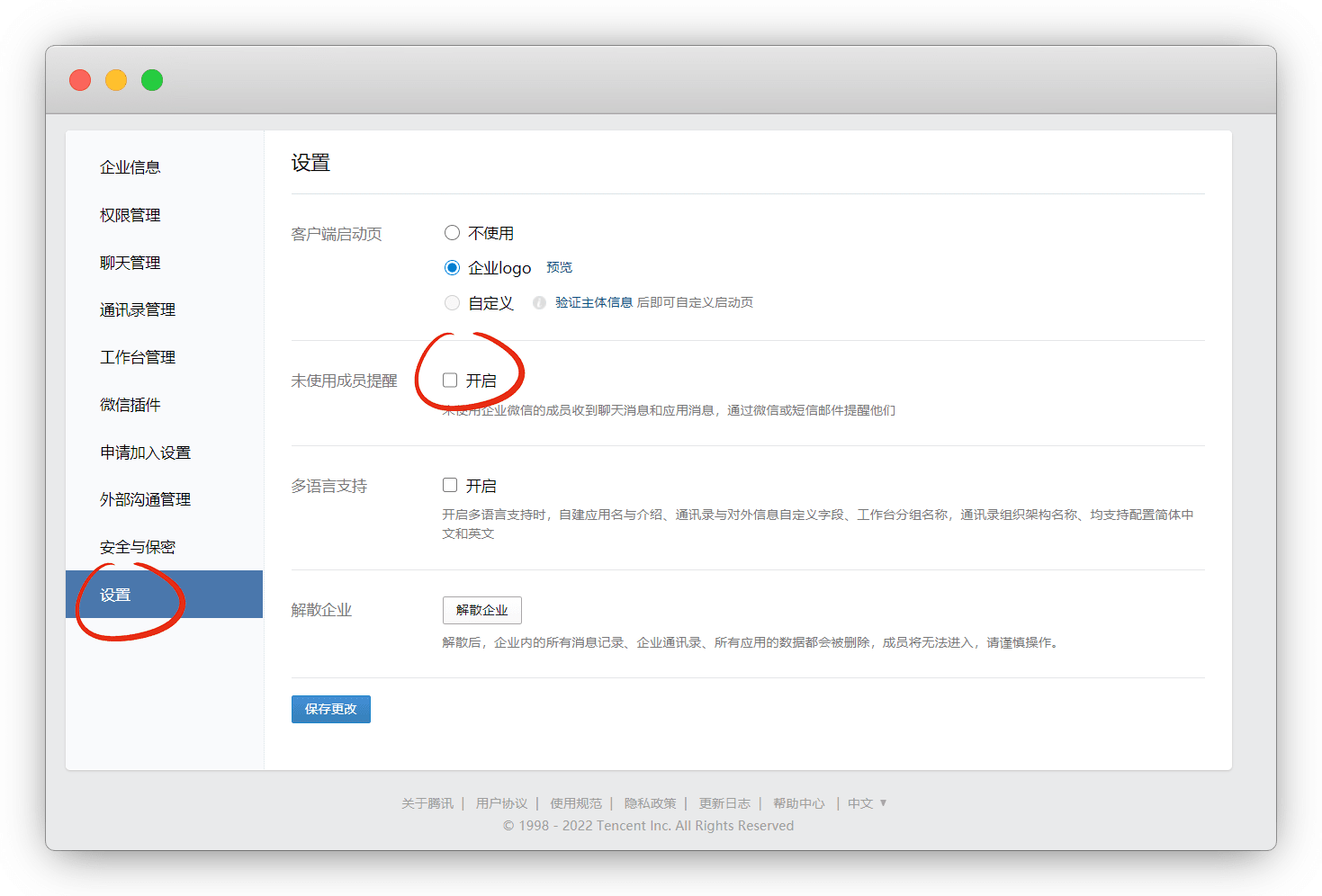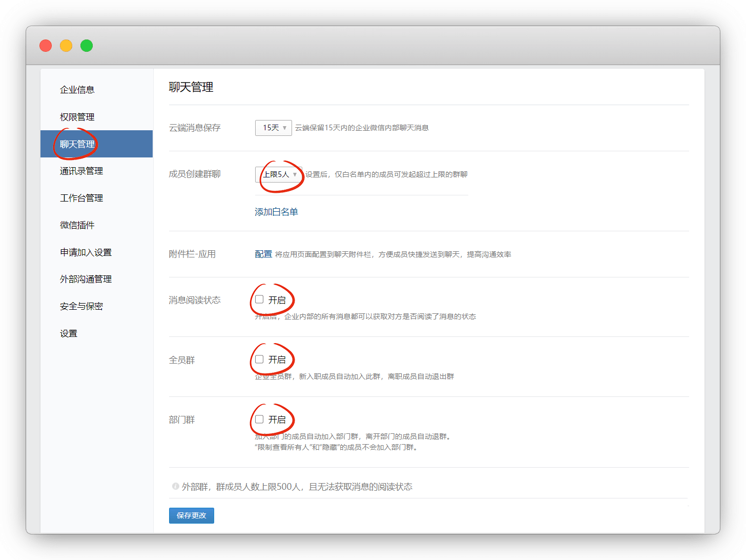 在 聊天管理 成员创建群聊上限改成最低,关闭 消息阅读状态、部门群 、全员群