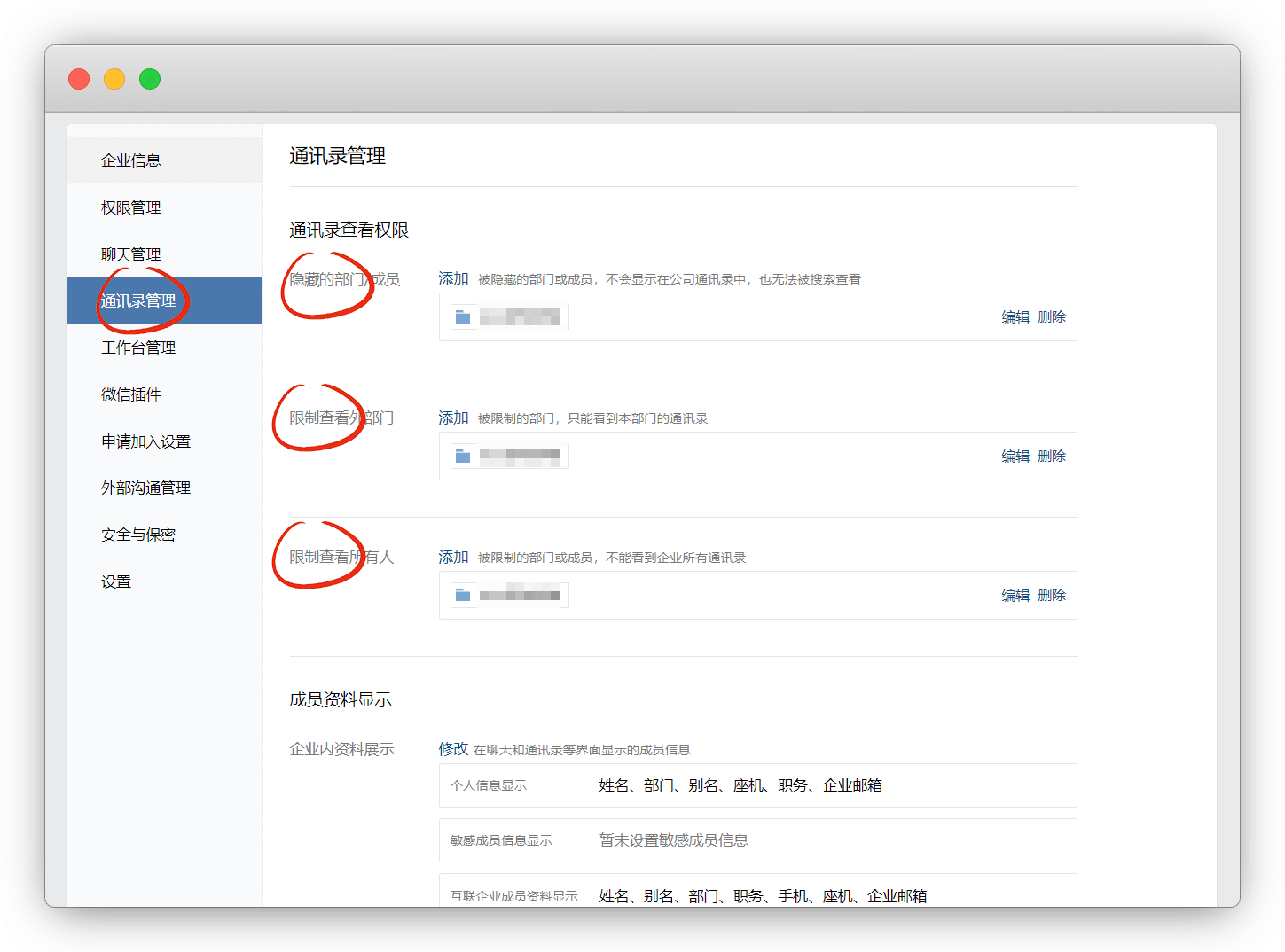 在 通讯录管理 中关闭通讯录访问权限,对所有⼈隐藏,主要是保护个人隐私
