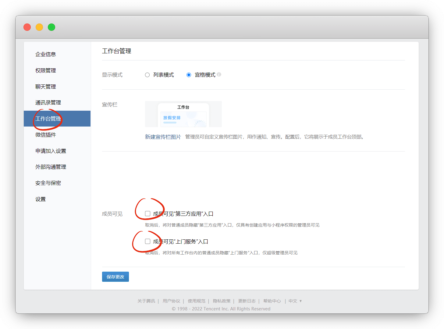 在 工作台管理 中关闭成员可见的 第三方入口 和 上门服务入口