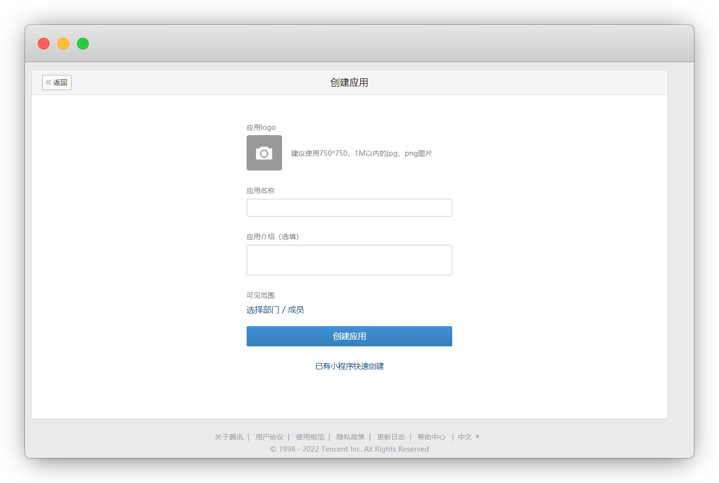 上传LOGO、填写应⽤名称,选择部门,创建