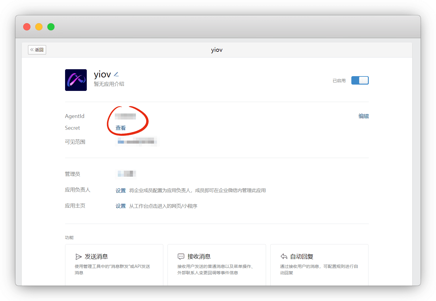 记下 AgentId ,点击 查看 获取 Secret