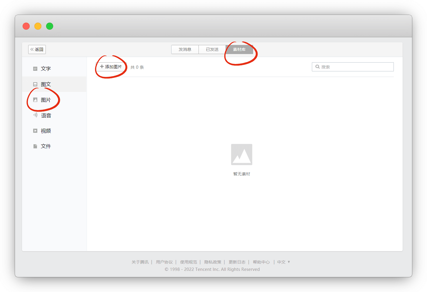 到 发送消息 中 发消息,素材库-图片-上传图⽚