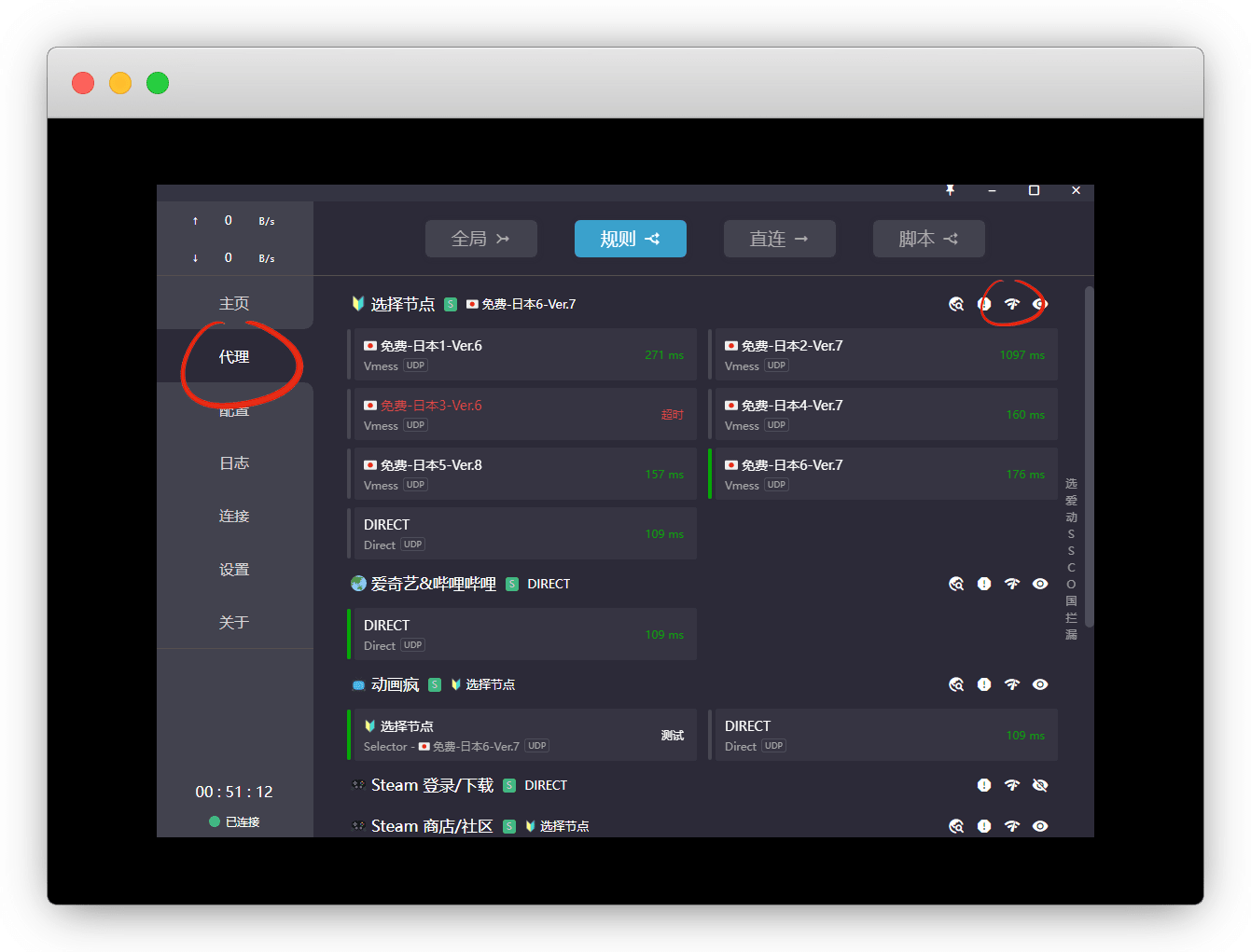 在代理中查看节点,点击WIFI图标测速,选择延迟低的使用
