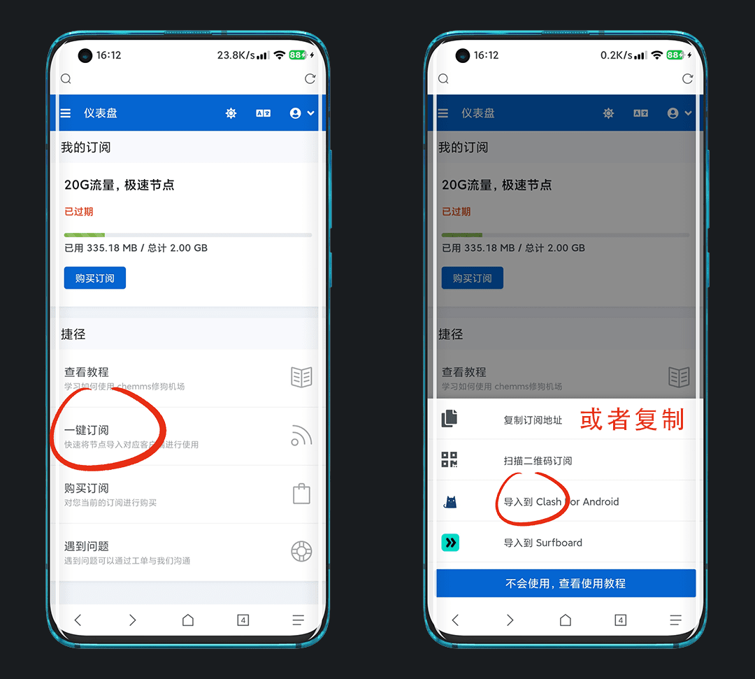 下拉找到订阅,选择 一键导入Clash ,也可以复制