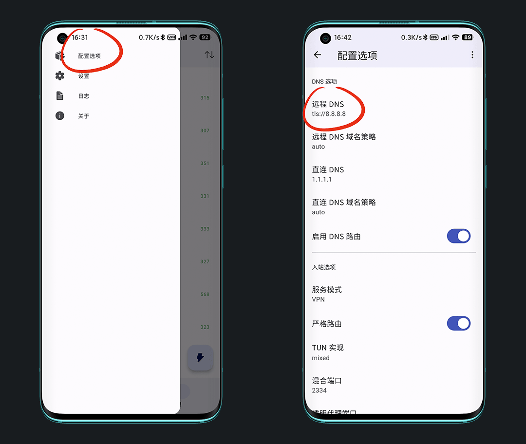 左上角三横 ≡ - 配置选项- 远程DNS改成 tls://8.8.8.8 或者 tls://8.8.4.4