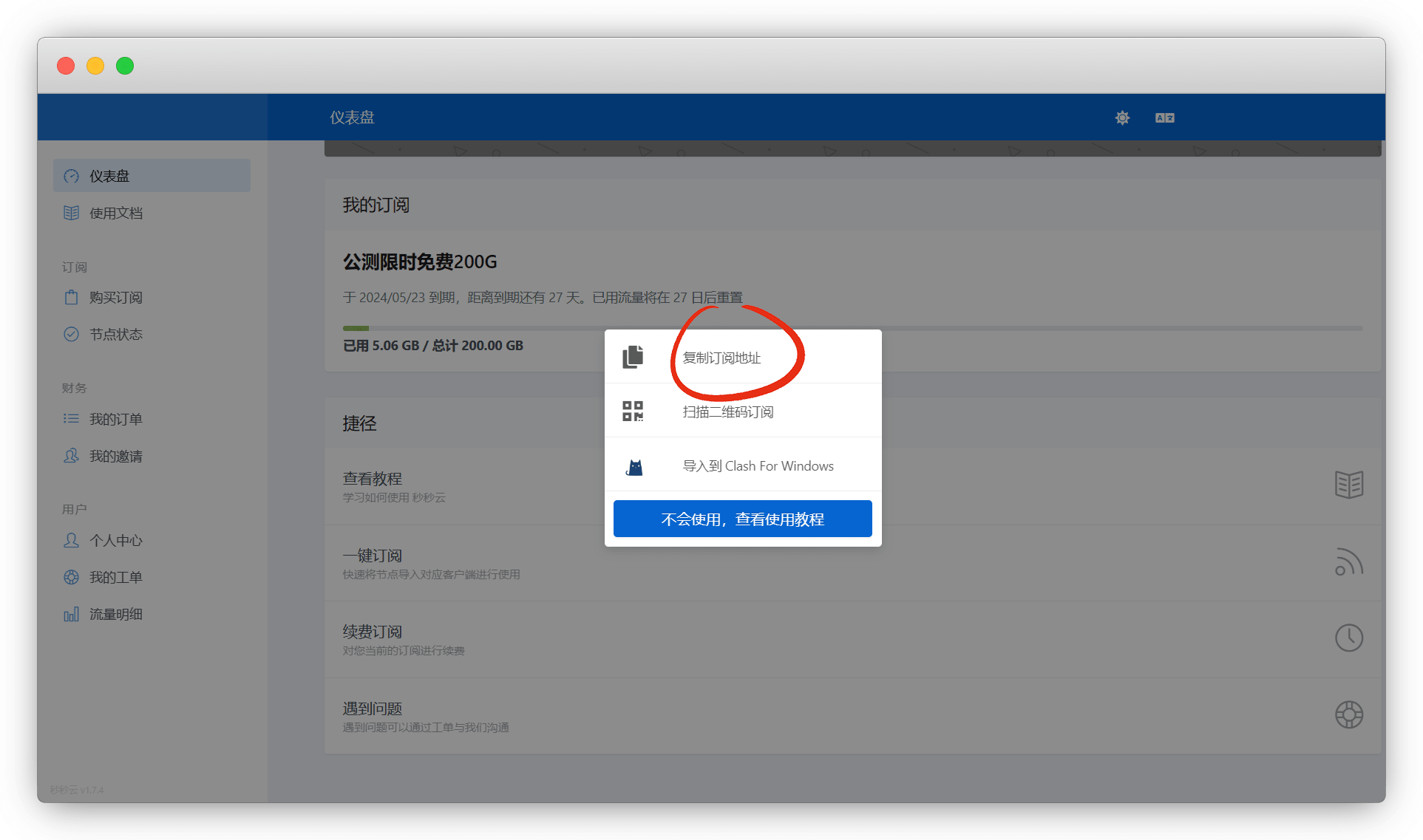 找一个 免费送流量的机场注册,一键订阅 - 复制订阅地址
