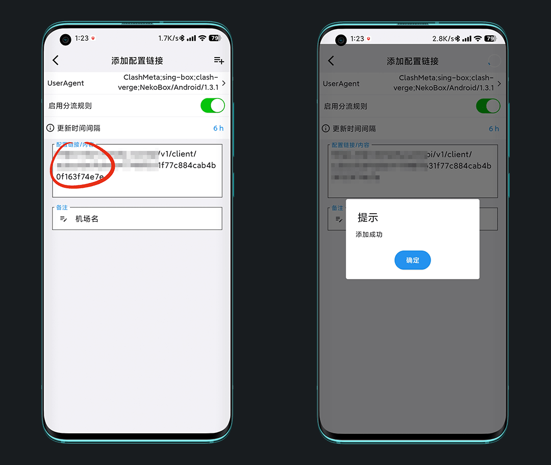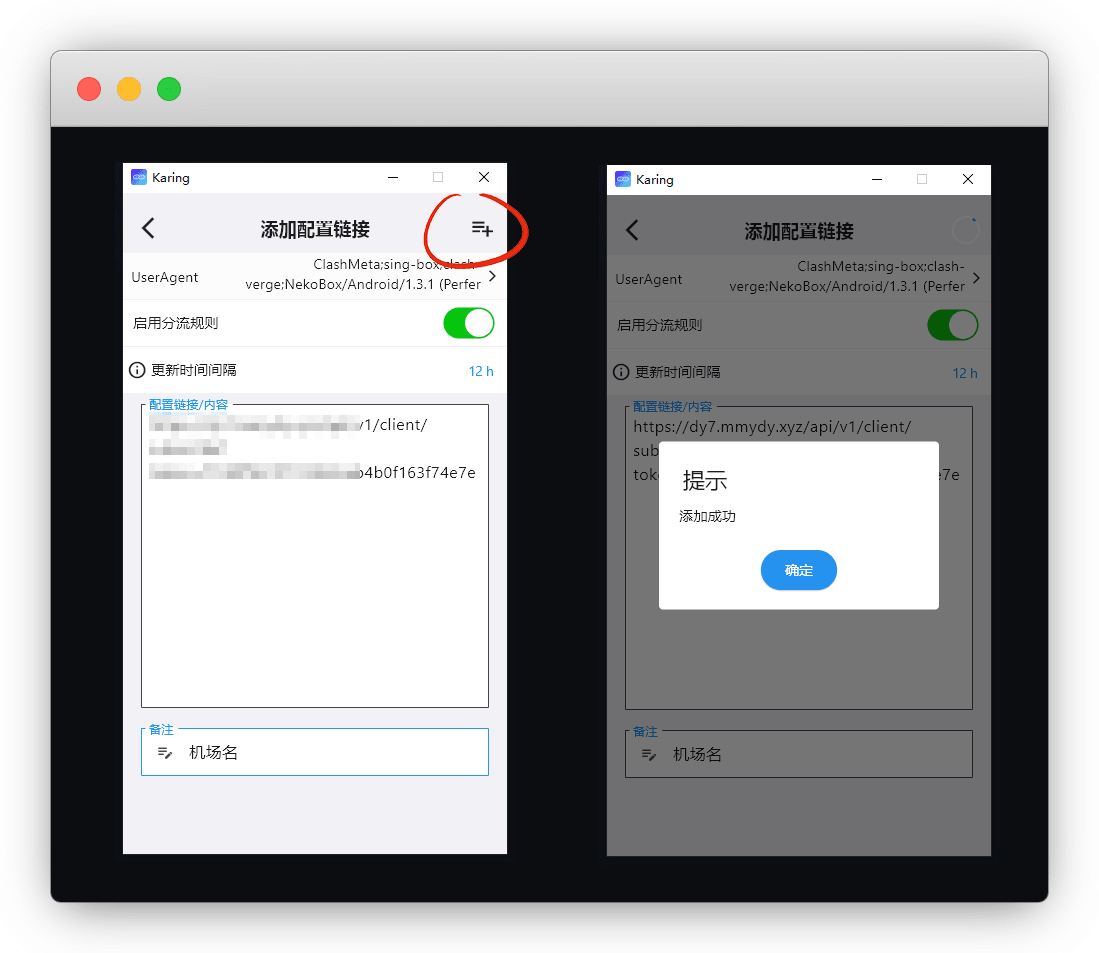 粘贴订阅链接,备注随便,右上角添加,成功提示即可