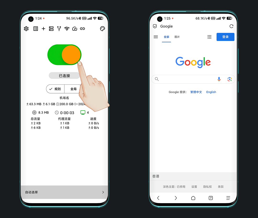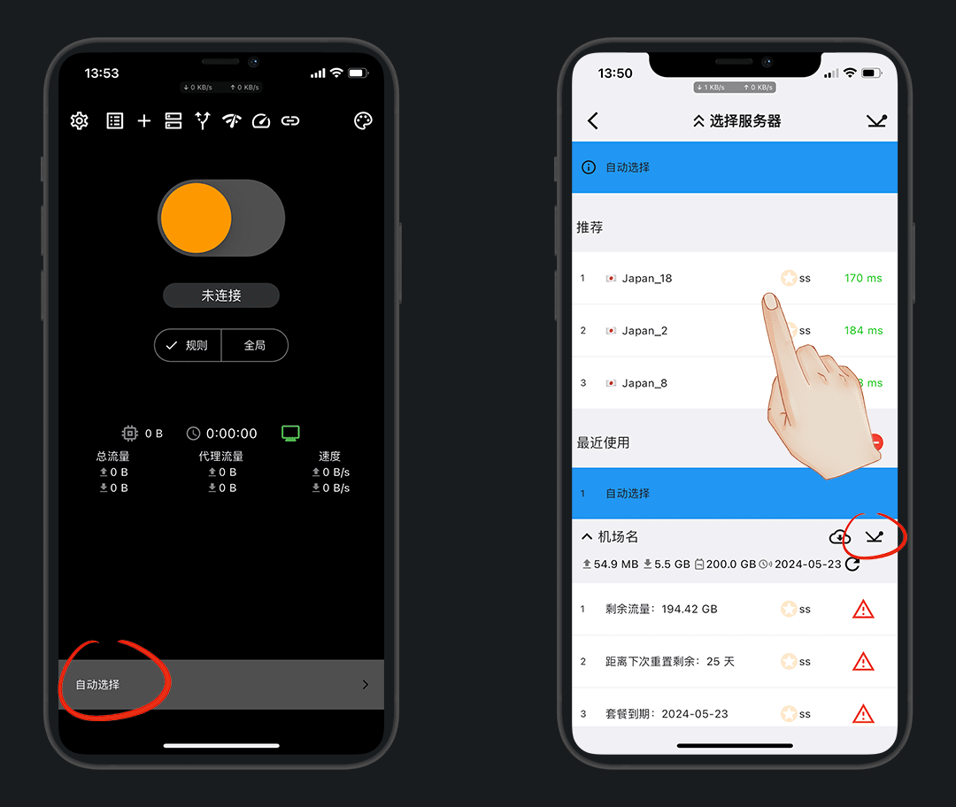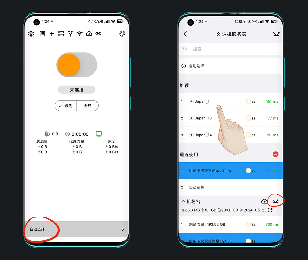 返回主界面底部,自动选择,订阅链接旁一键测速,会自动筛选出3个最优的,点击任意一个使用