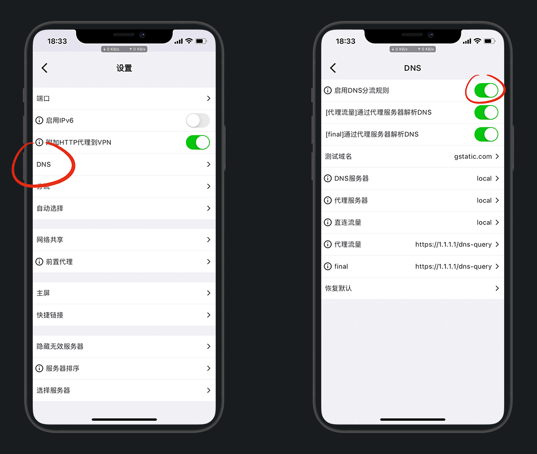 为了避免后续导入节点使用问题,在 设置 - DNS - 打开 启用DNS分流规则 开关