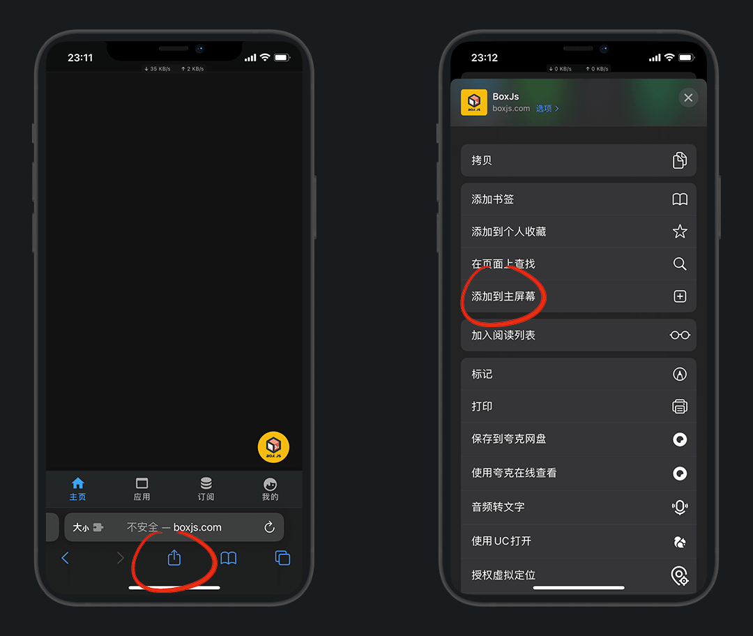 进入BoxJs后 - 底部分享 - 添加到主屏幕