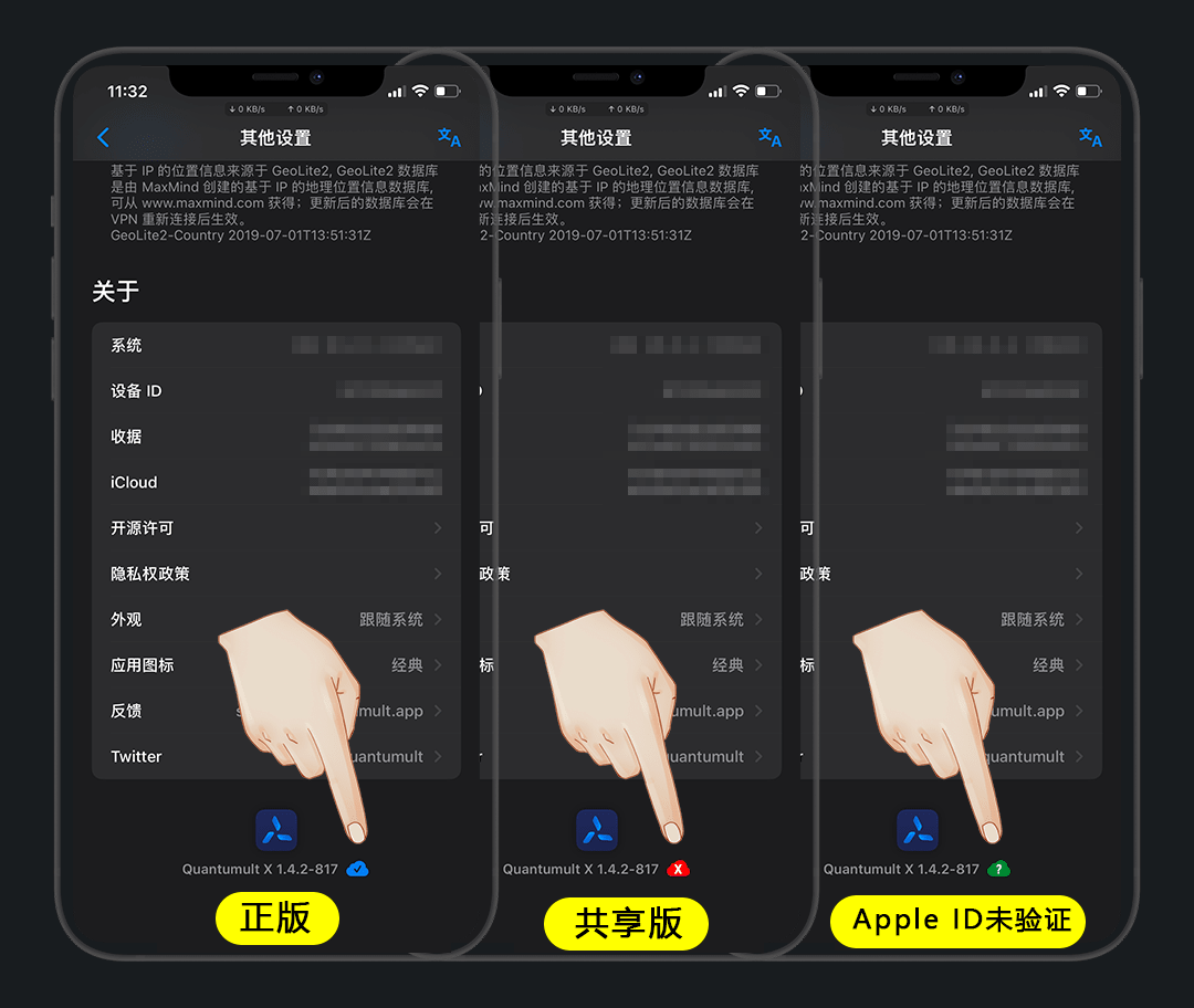 版本号后面蓝色的是正版,红色和绿色皆为非正版,不建议使用
