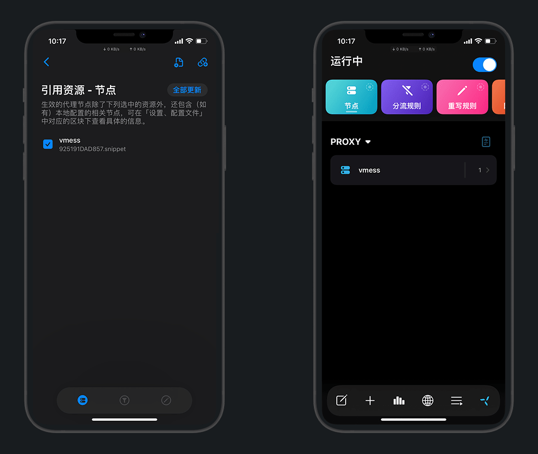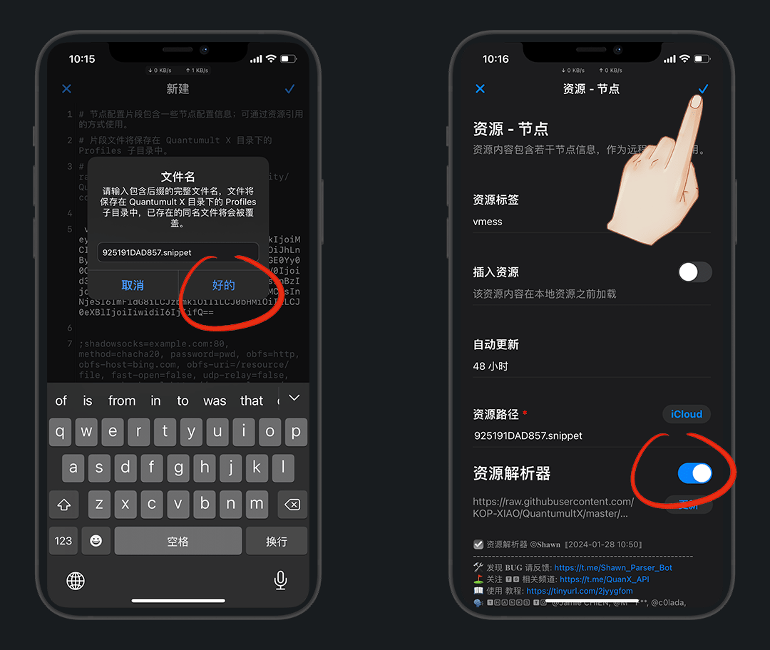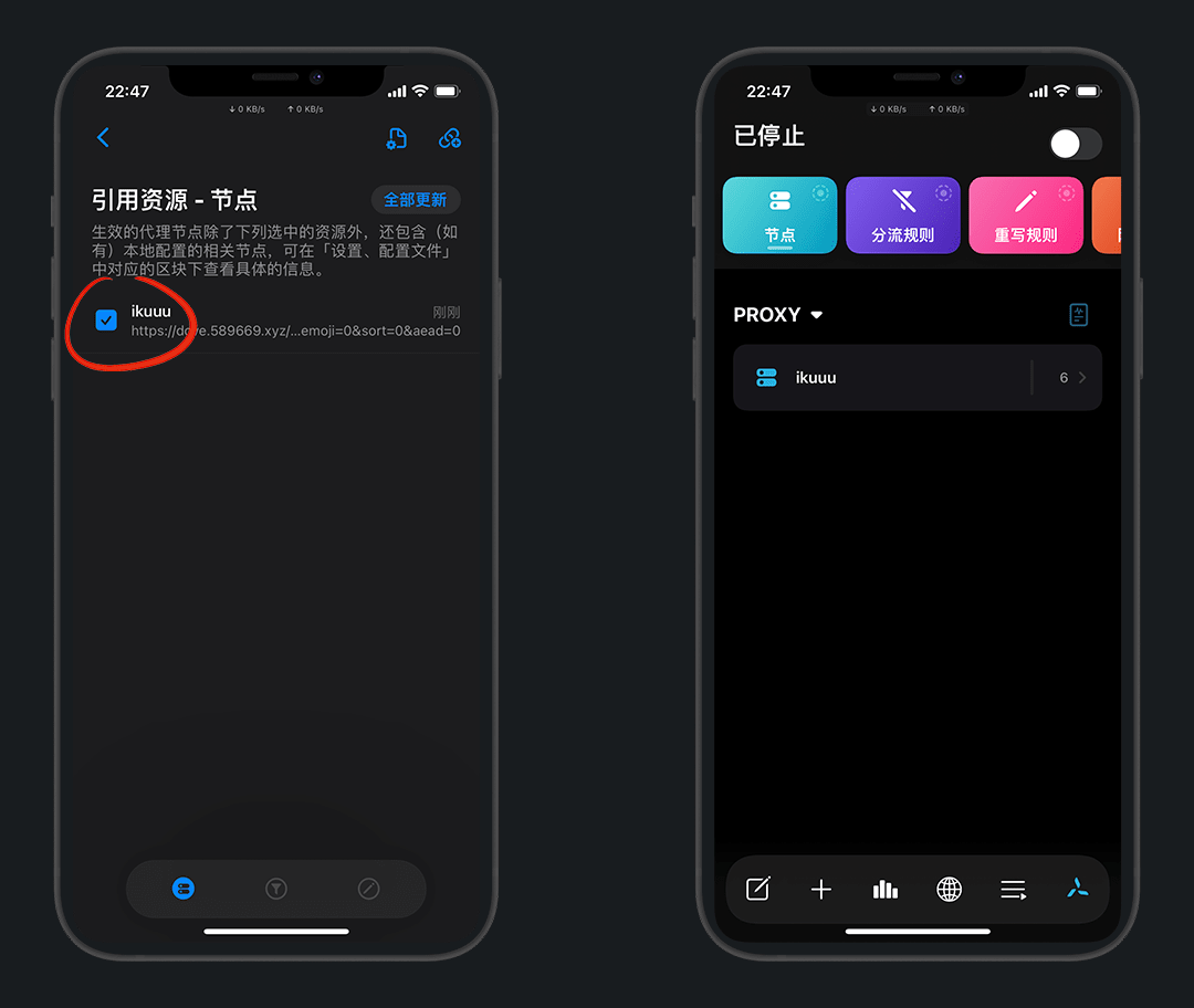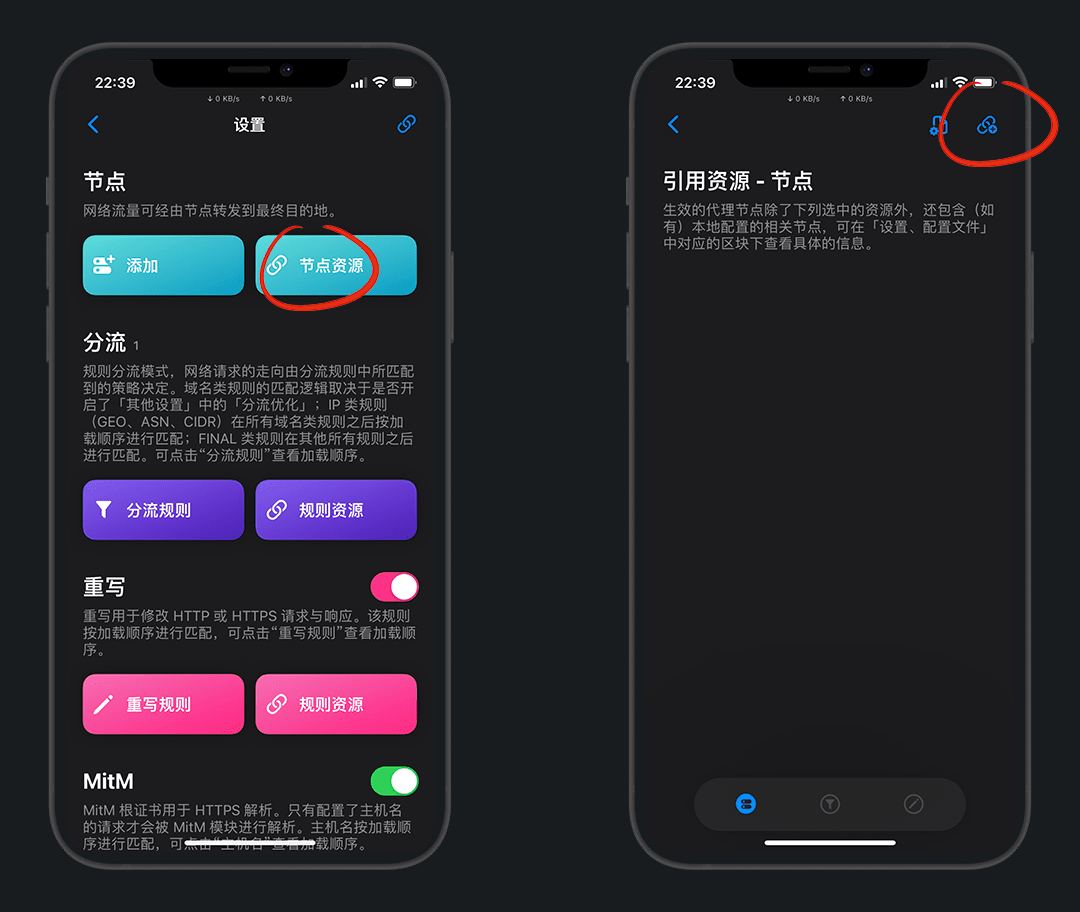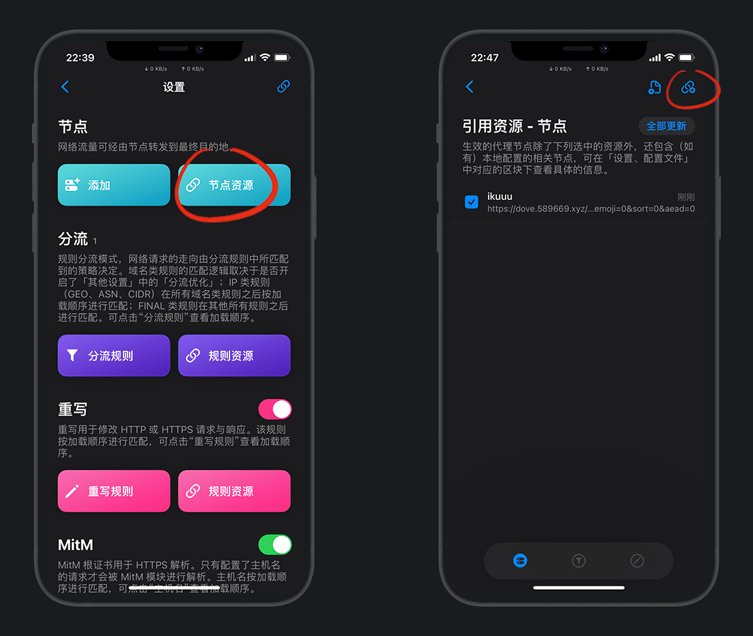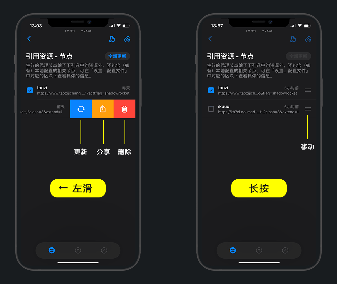 在节点资源中,左滑可以更新/分享/删除,长按可以移动顺序,点击可以编辑