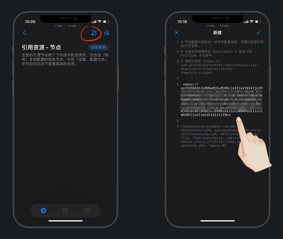 进入节点资源,右上角第一个是 配置片段 - 新建 ,适用于一些分享的节点