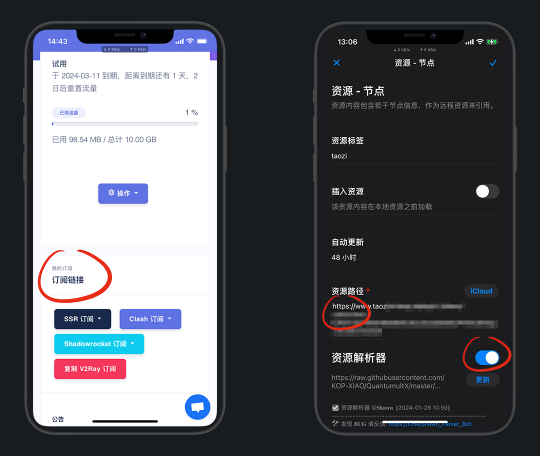 找 白嫖机场 演示一下,复制任意订阅,粘贴到 资源路径 ,打开资源解析器开关