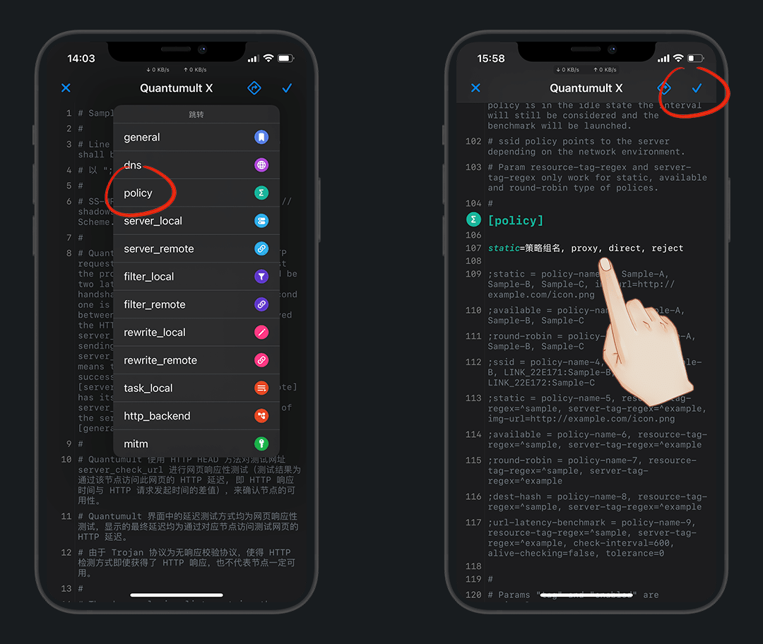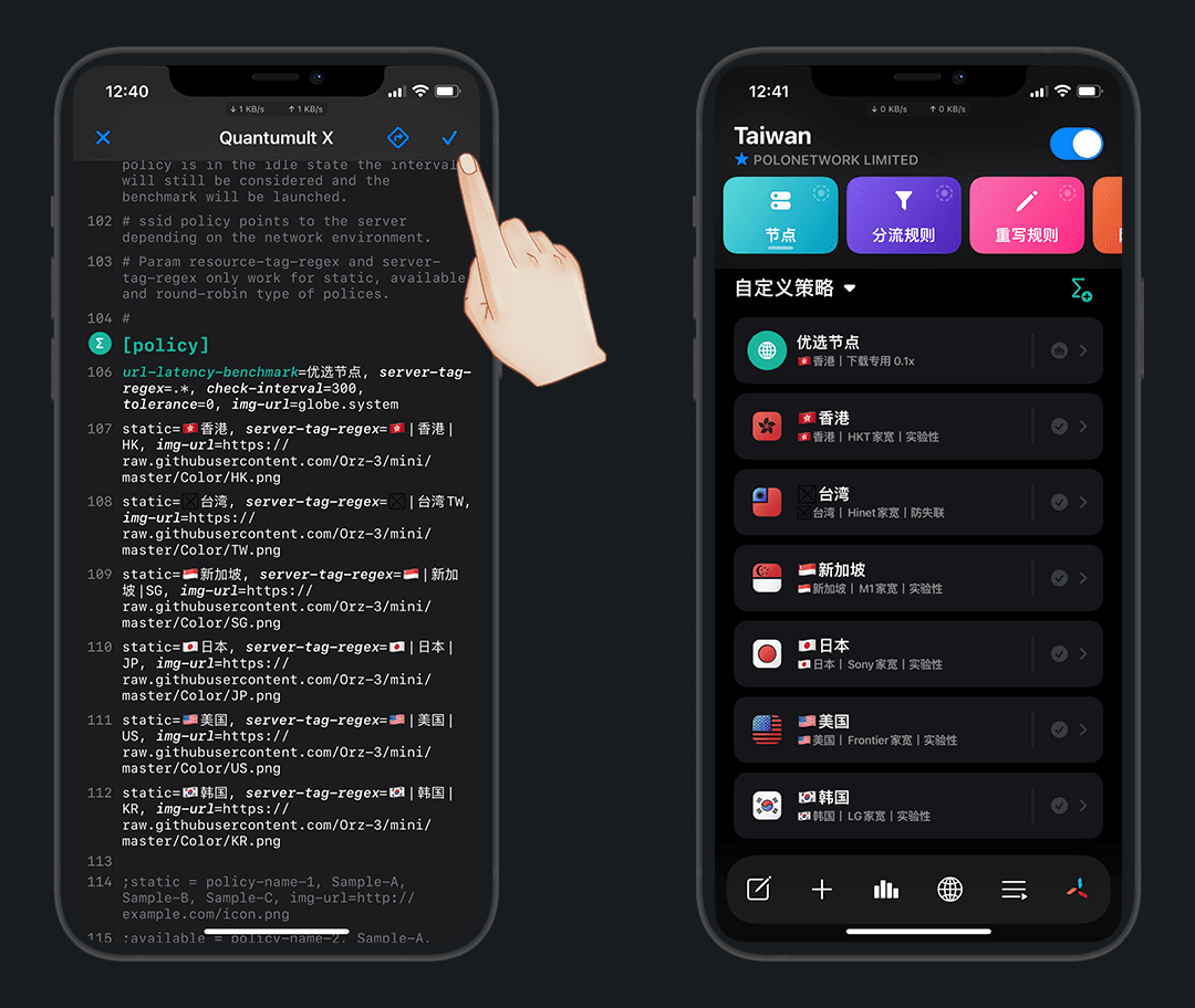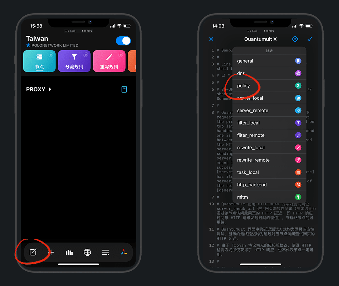 点击 policy ,粘贴默认策略组格式