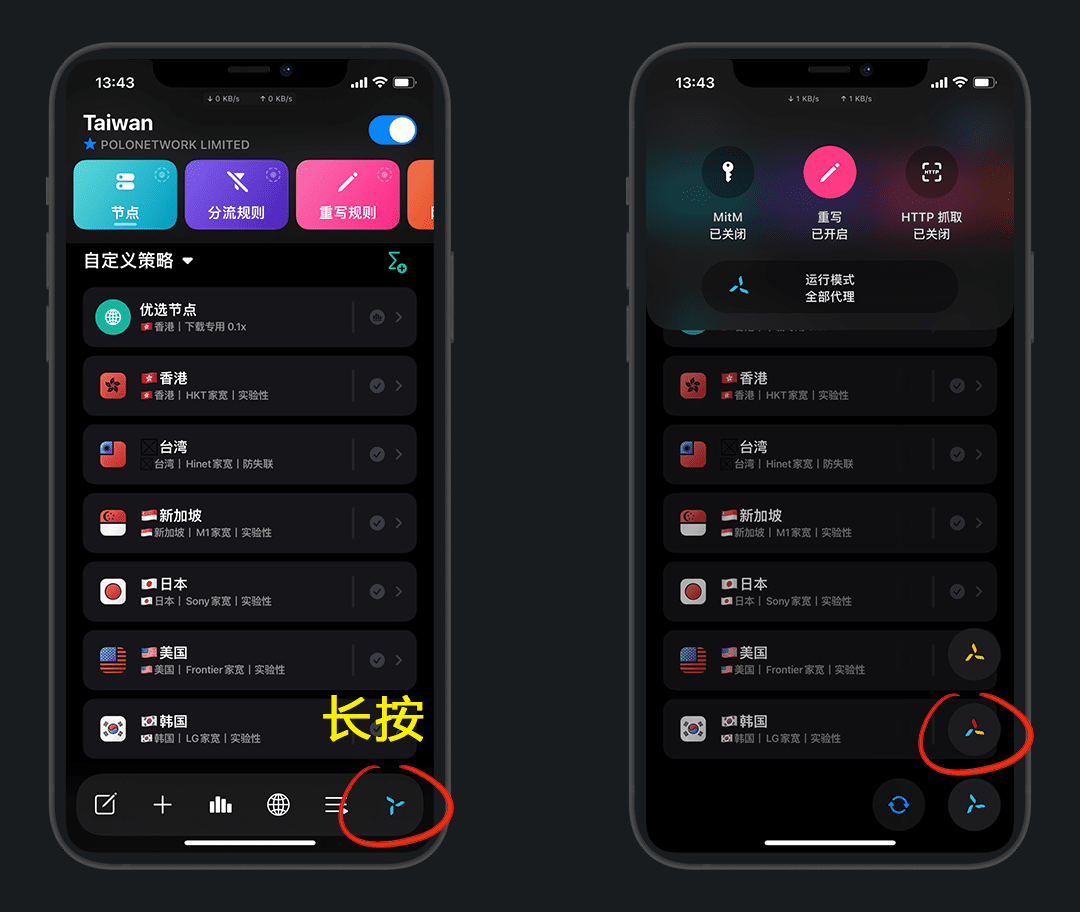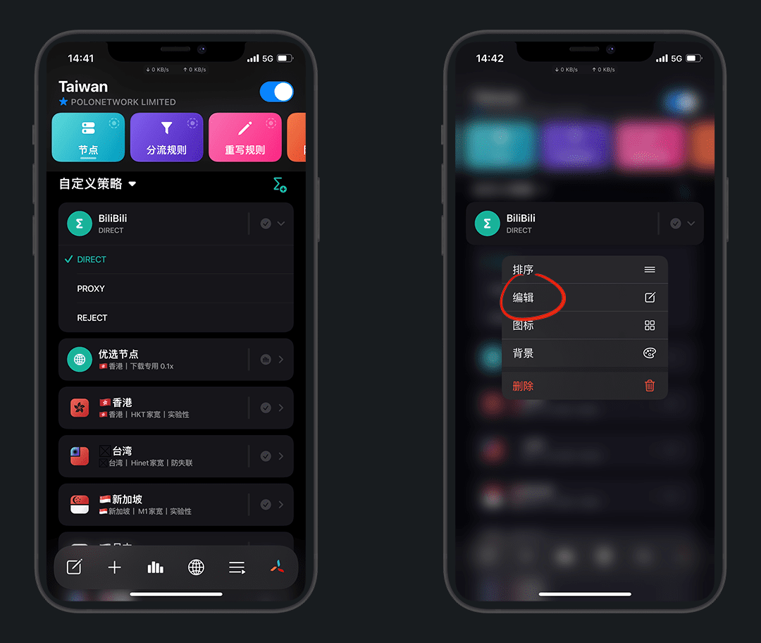 长按策略组还可以进行编辑,添加节点等操作