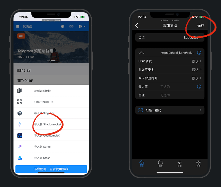 选择对应的工具,我这里选 shadowrocket,跳转后点右上角保存