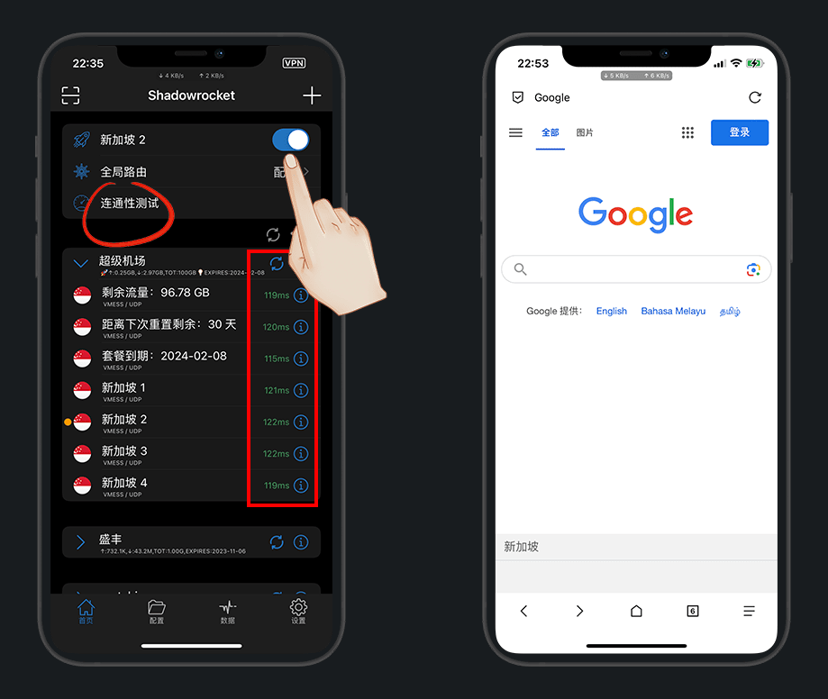 点击 连通性测试 选择延迟低的,打开开关,上 谷歌 看看是否成功