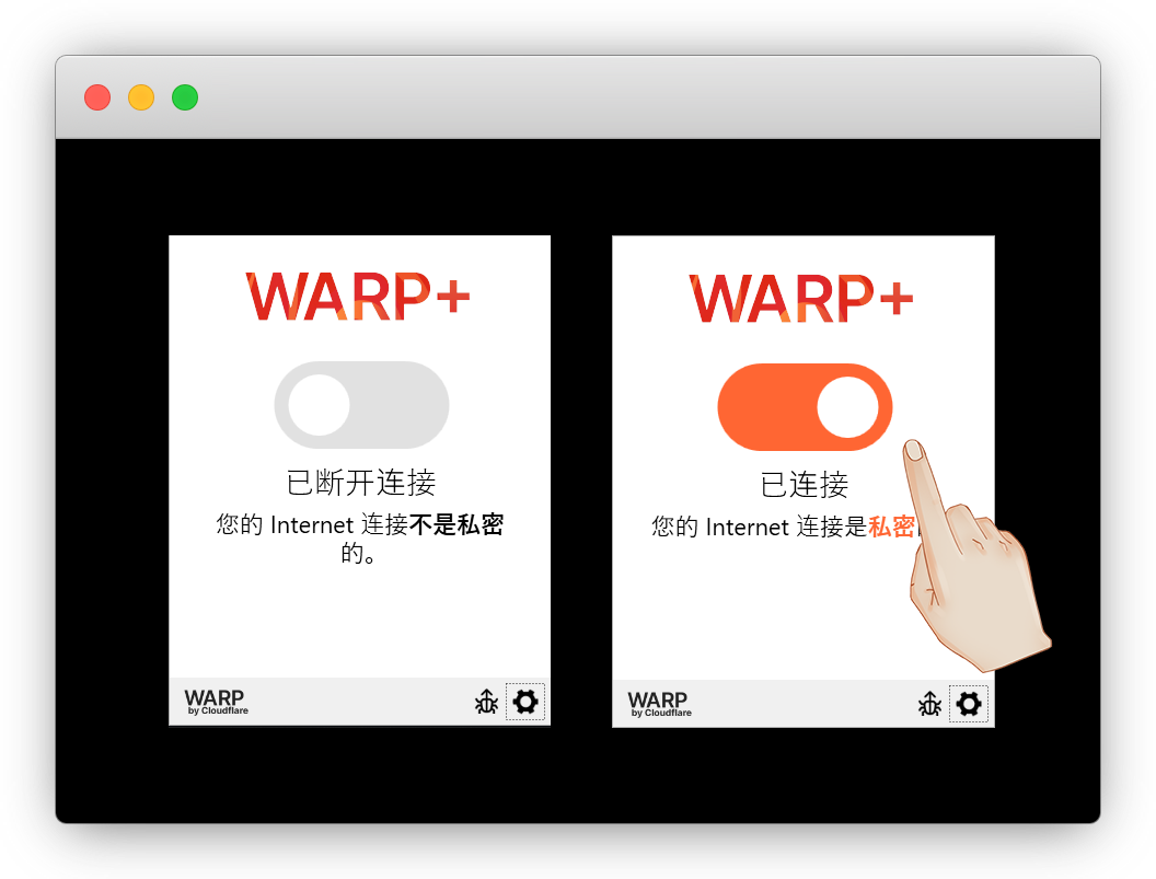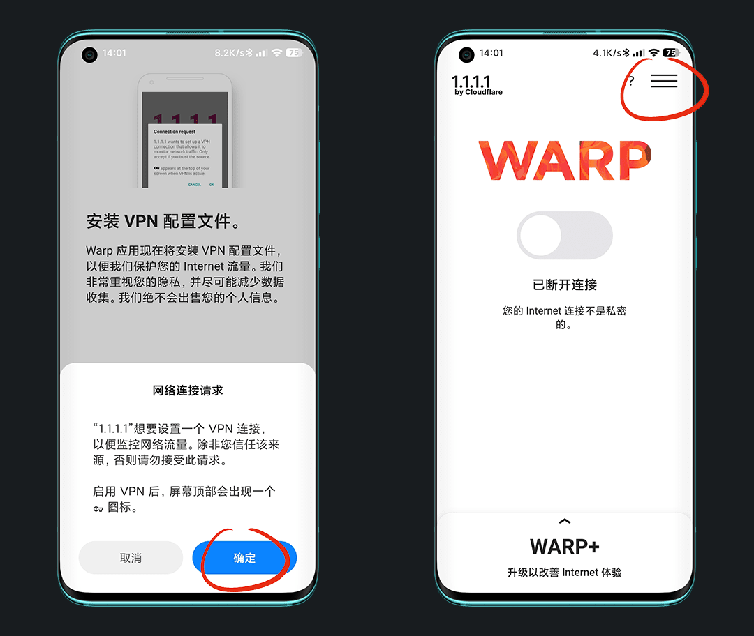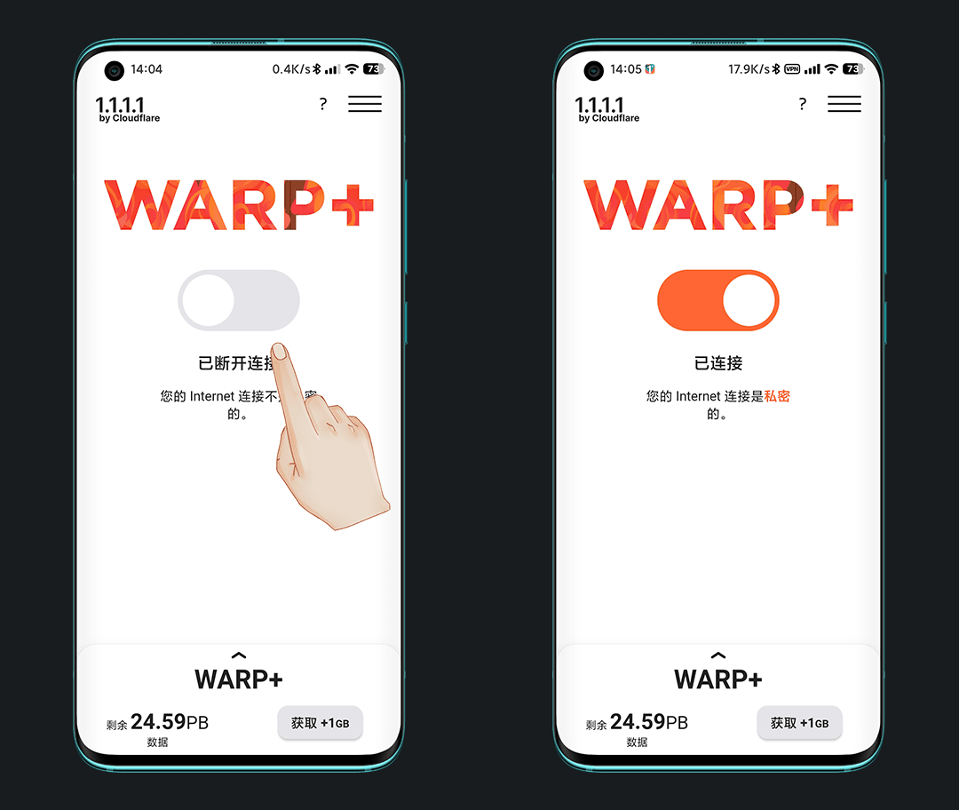 返回看WARP已经变成了 WARP+ ,打开开关,提示连接是私密的即可