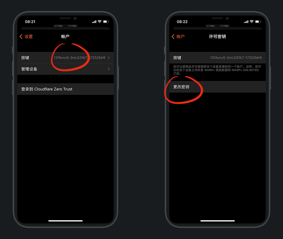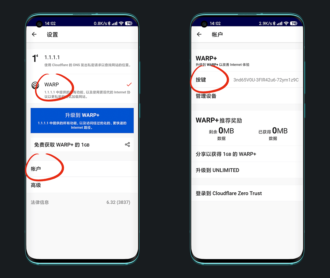 会获得一个无限流量的密钥,我们复制粘贴到 1.1.1.1 app中,存储
