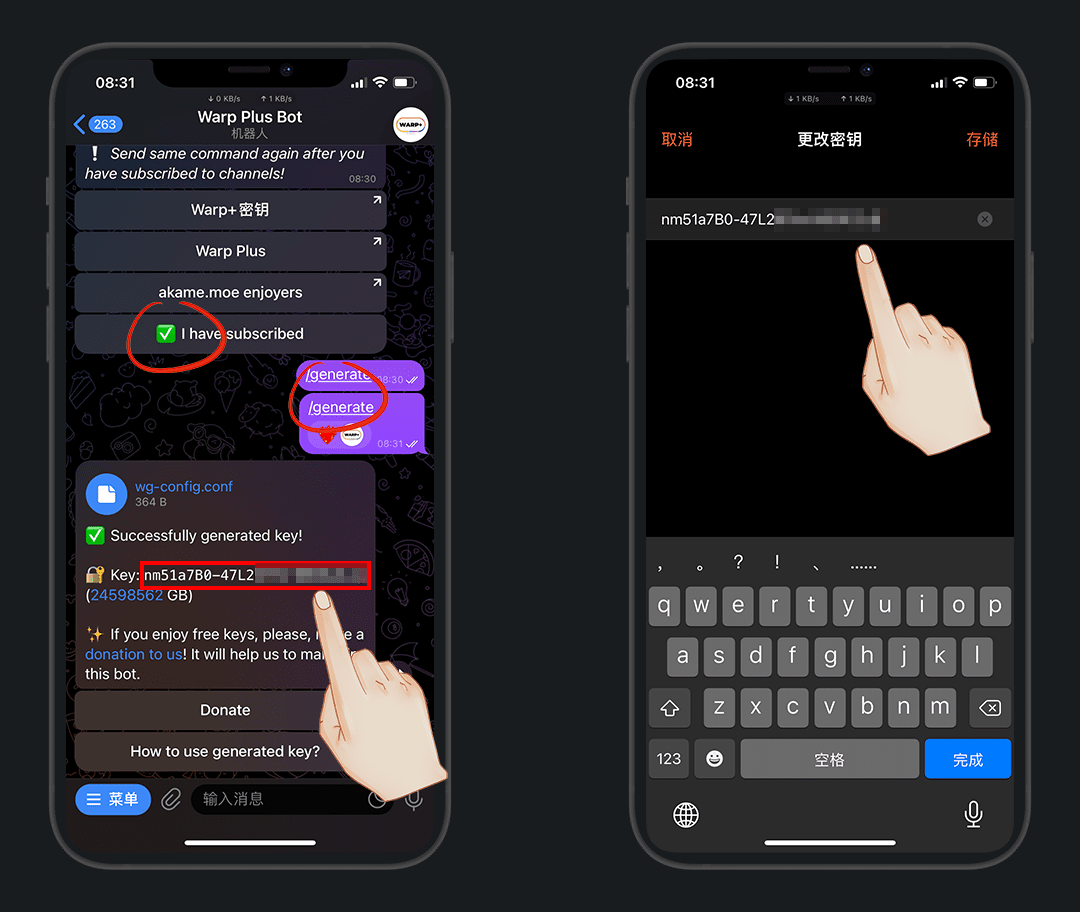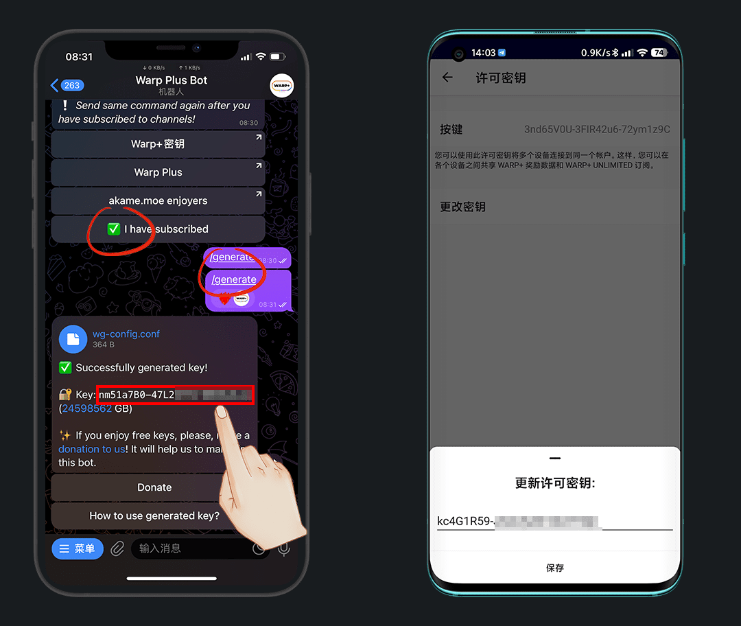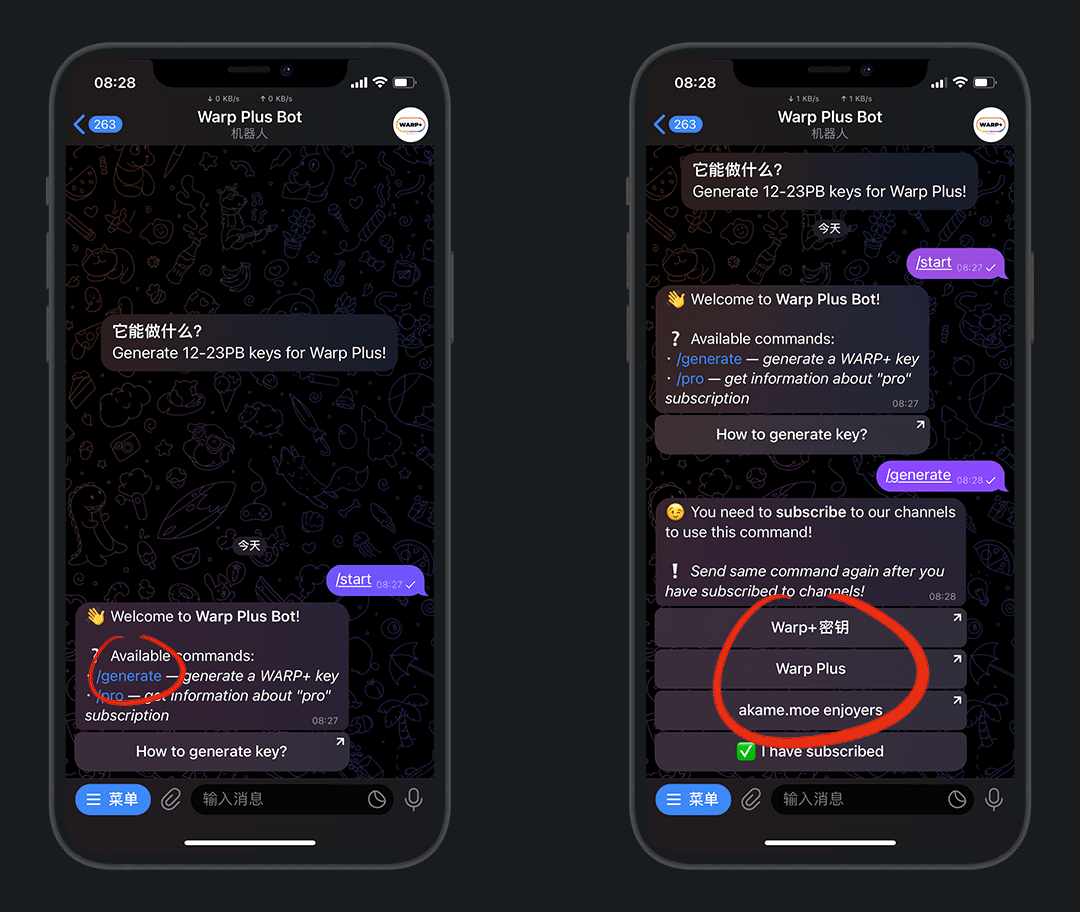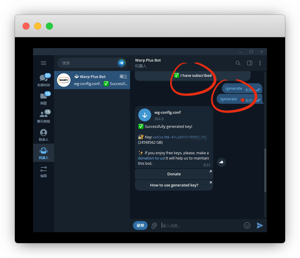 我们先去Tg获取密钥,在Tg搜:@generatewarpplusbot