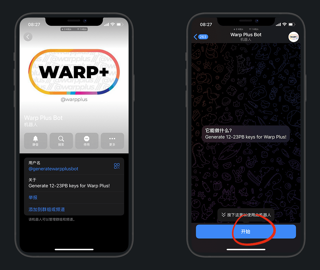 在Tg搜:@generatewarpplusbot,进入机器人对话,点开始