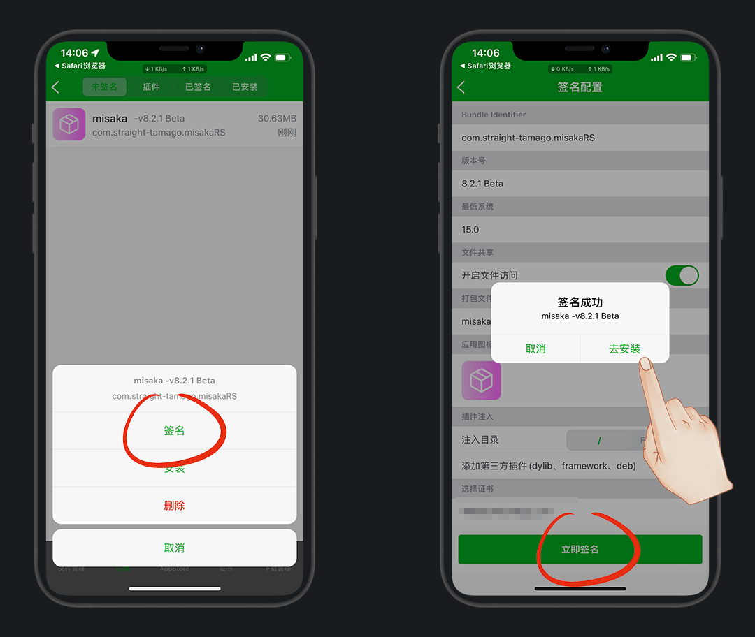 在已签名的页卡中,选择刚签好名的 misaka 安装