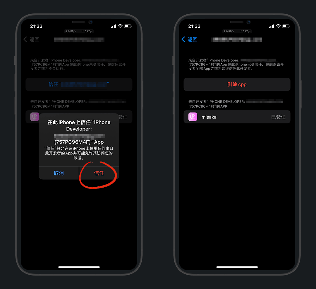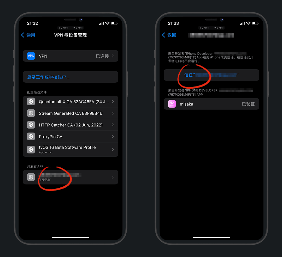 设置 - 通用 - VPN与设备管理 - 选择 开发者APP - 信任