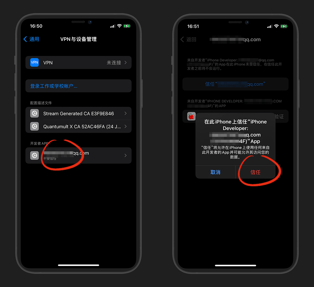 设置-通用-VPN与设备管理-显示自己的苹果ID处-信任