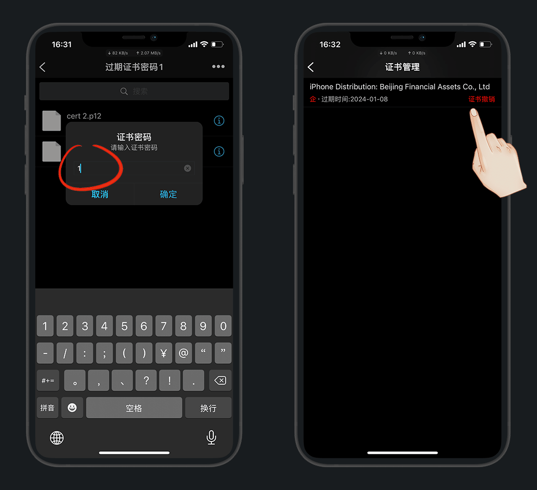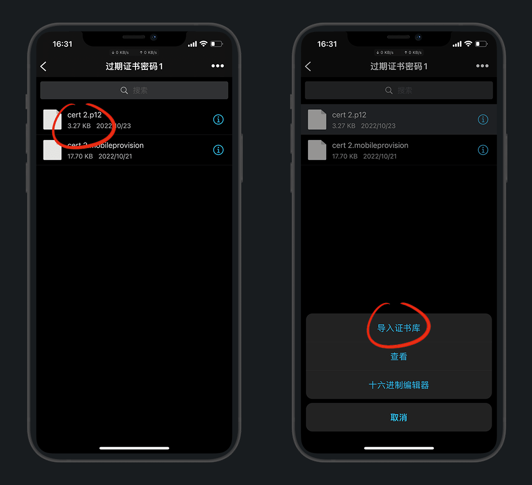 点击 cert 2.p 12 导入证书库,输入密码 1,在设置-证书管理可看到