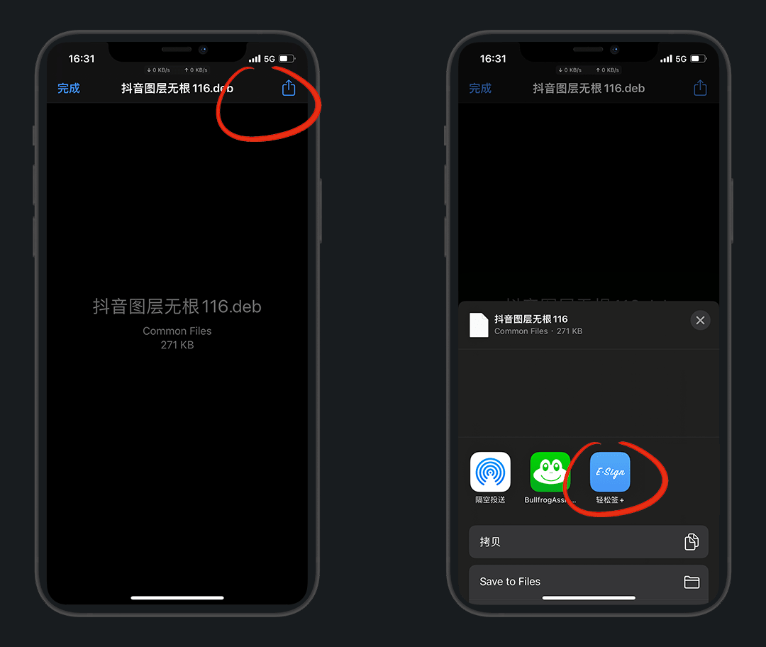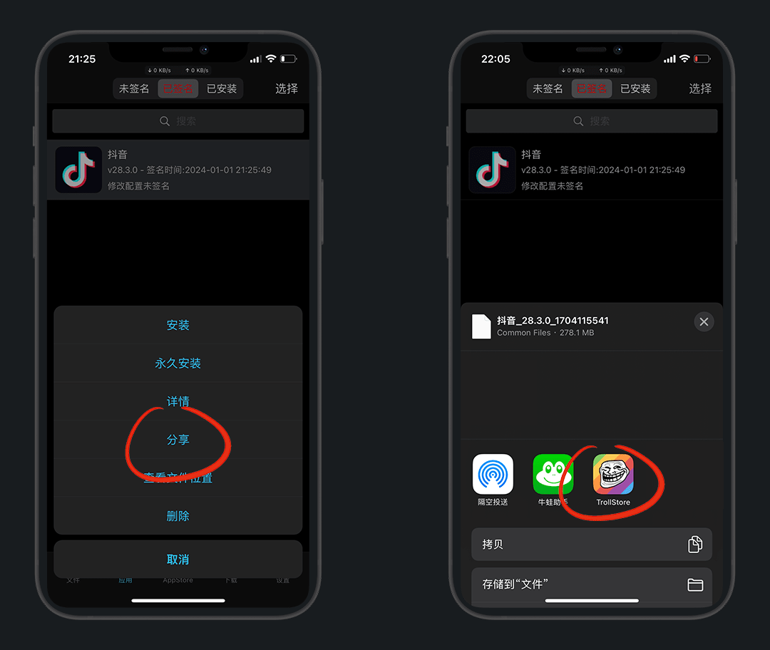 返回已签名页卡,选择抖音 - 分享到巨魔安装