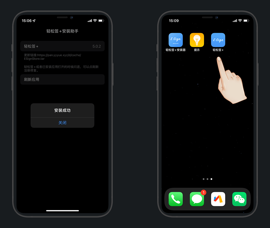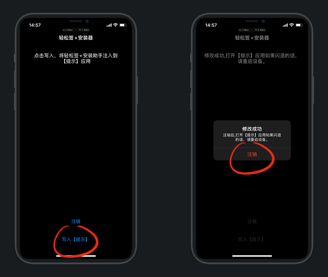再次打开 提示 App,就注入成功了,安装轻松签