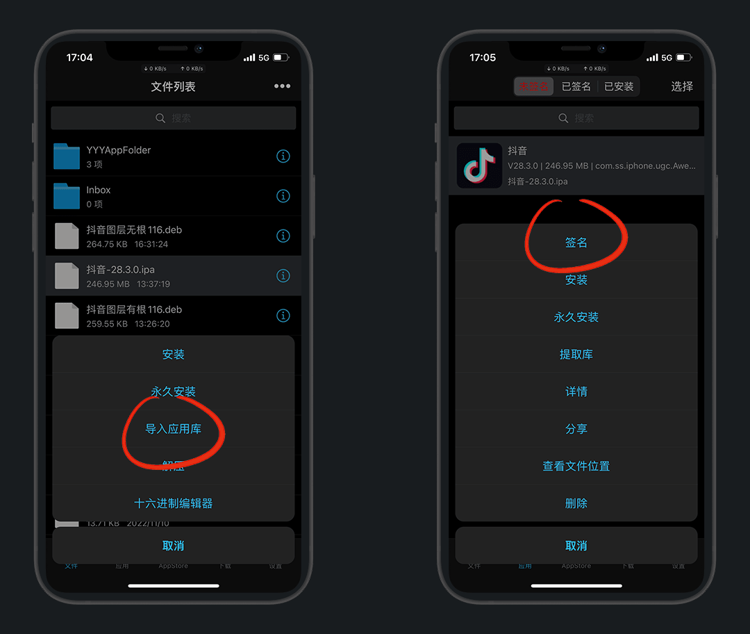 将抖音导入应用库,然后签名