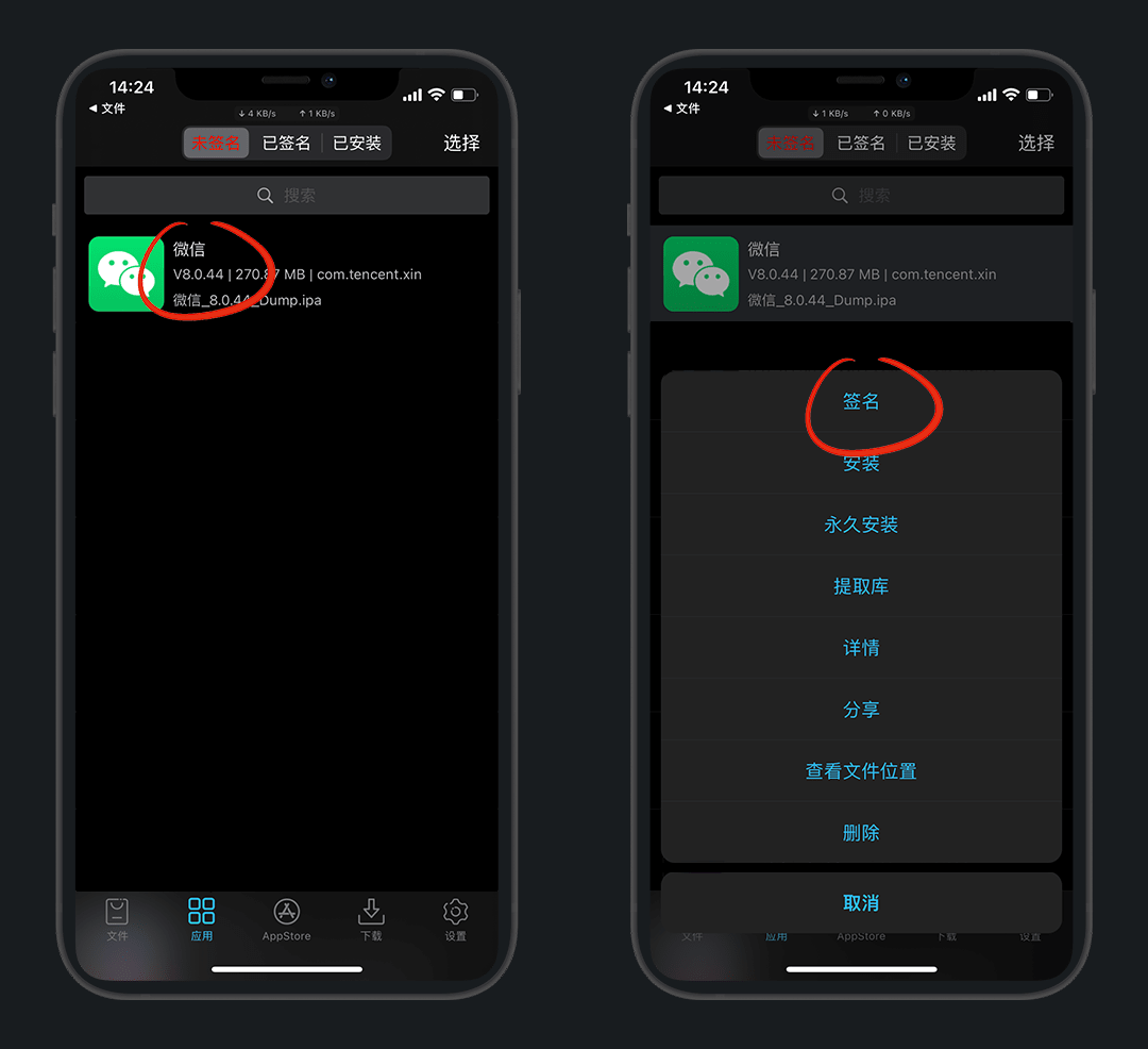 将ipa包导入应用库,在 未签名 页卡也可以提取