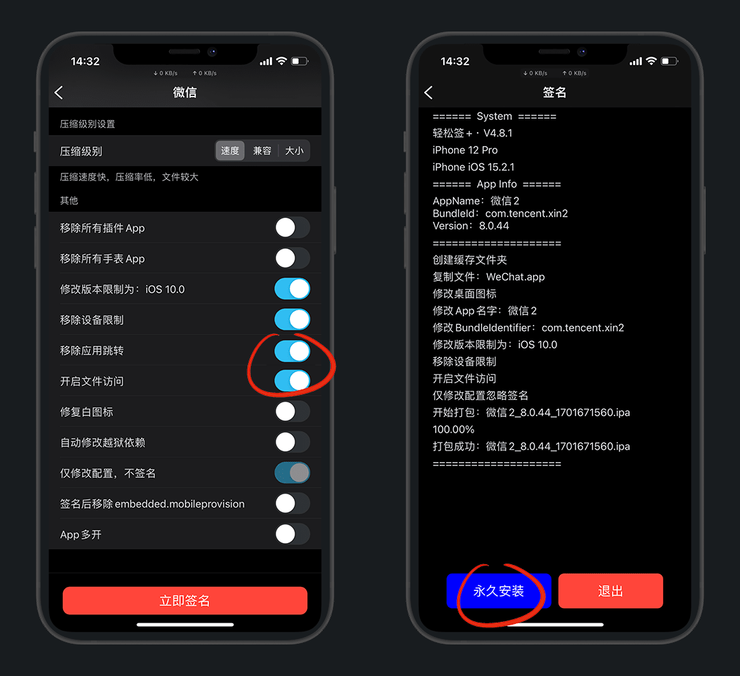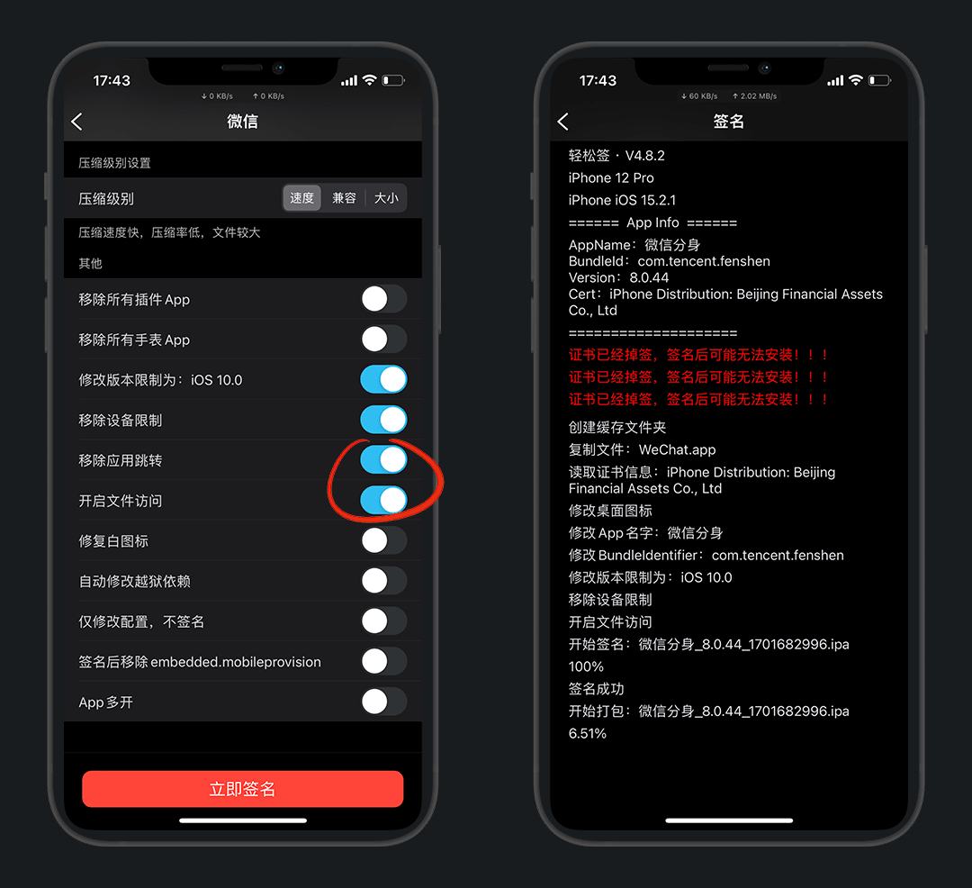 然后下拉,建议打开 移除应用跳转 和 开启文件访问 开关,立即签名
