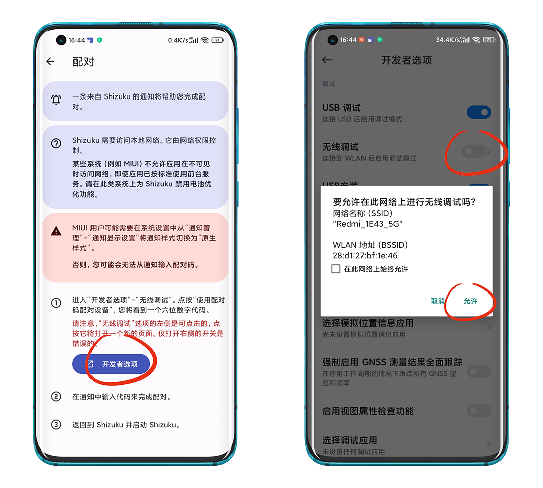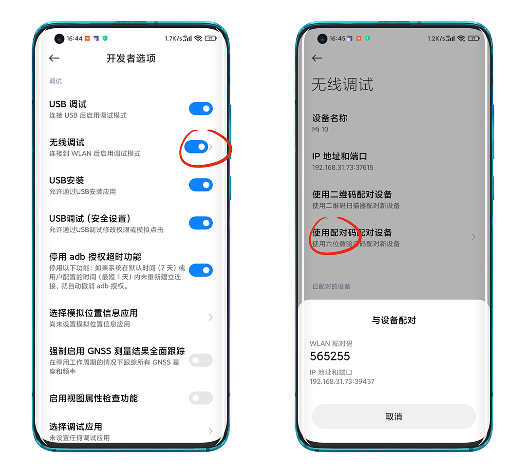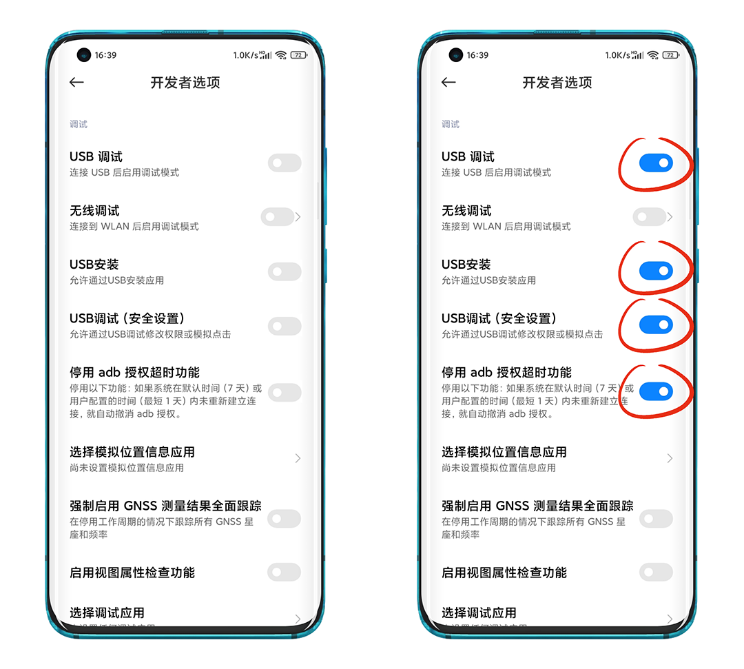 下拉打开 USB调试等 和 停用adb授权超时 如图