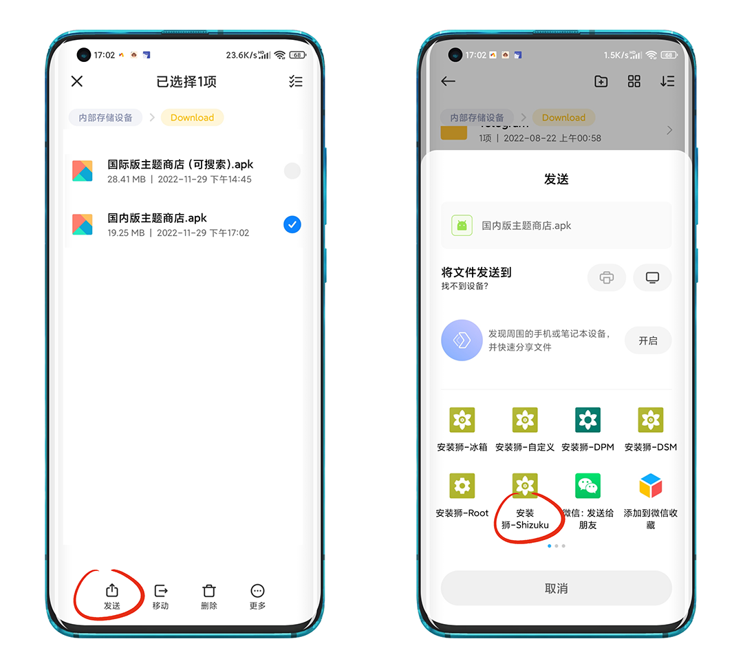下载 小米商店_国际版 ,在下载的文件夹长按下载好的文件 - 发送 - 选择 安装狮-Shizuku