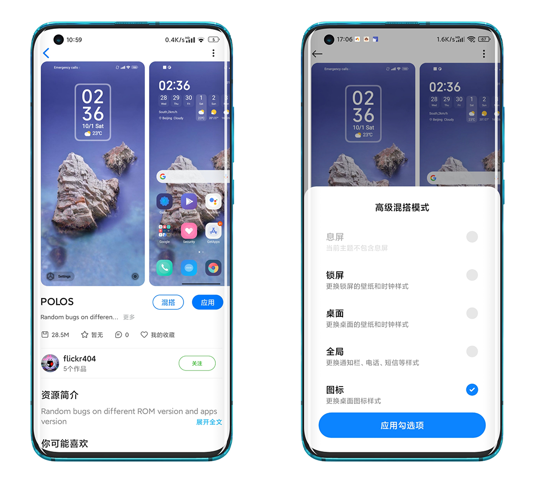 安装回国内版后进入商店 - 主题 - 点击下载好的主题 - 混搭,勾选想要的应用即可