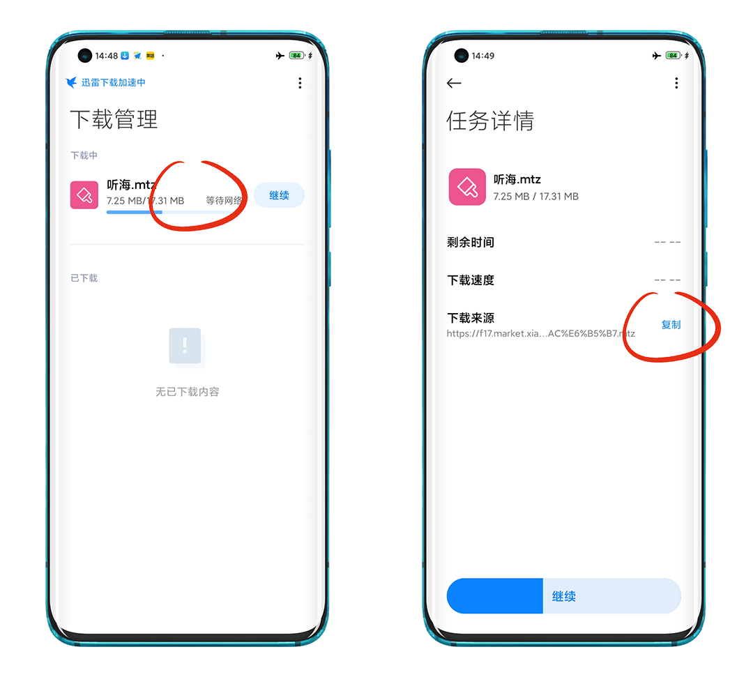 打开下载管理,未完成的任务进去,里面的下载链接复制出来就可以了,mtz格式可以直接导入