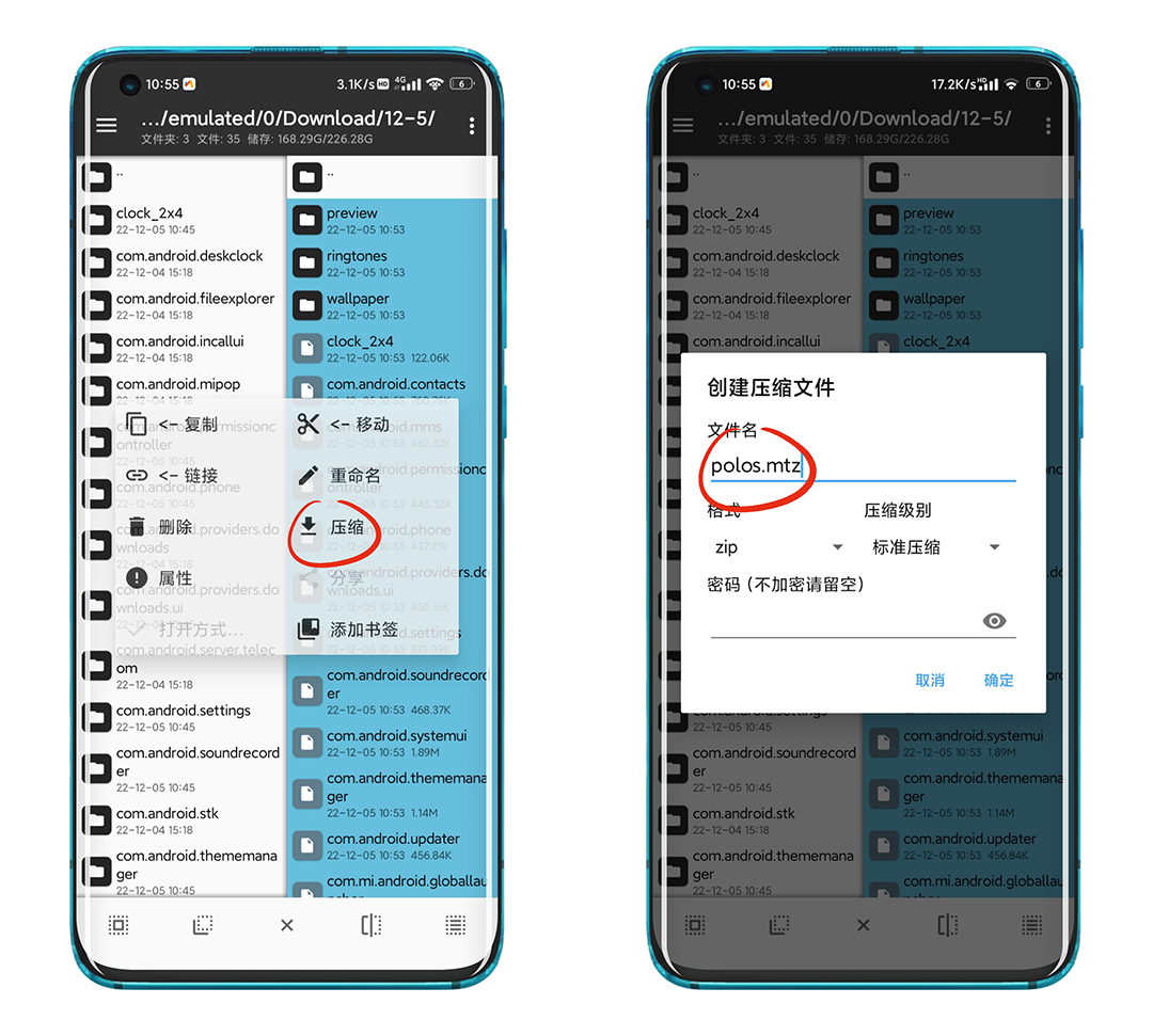 </theme>整理完毕后,右上角全选,长按文件 压缩,命名为 *.mtz