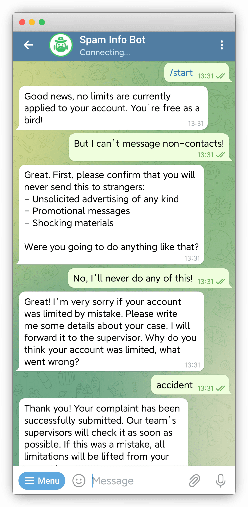 搜索机器人 Spam Info Bot,按步骤点击后,最后输入 accident
