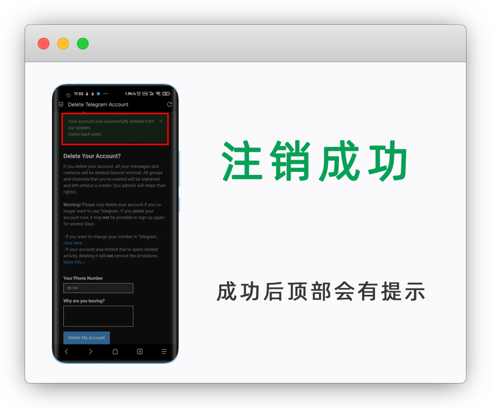 注销成功会提示,APP的账号也自动退出登录,重新注册即可