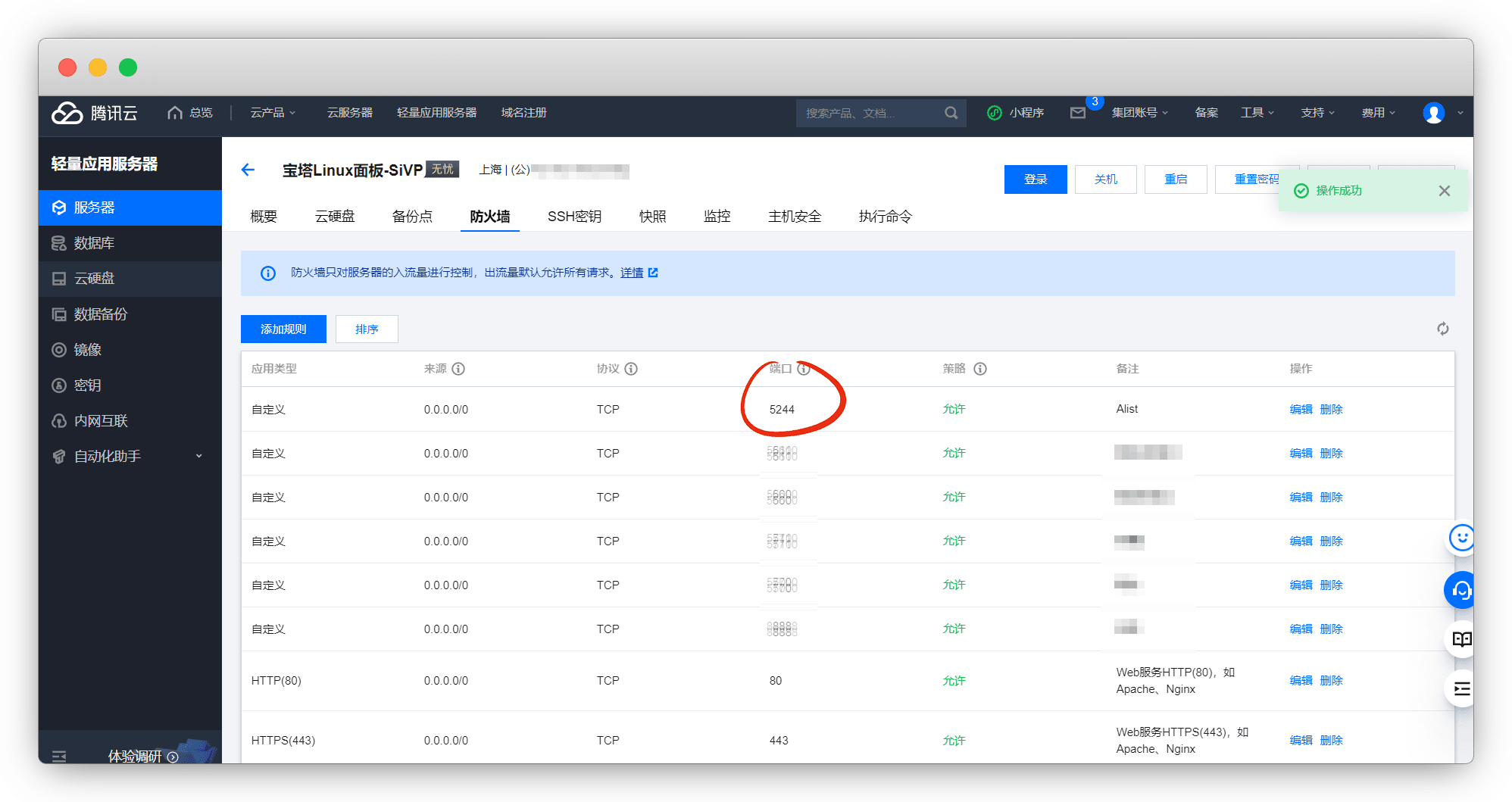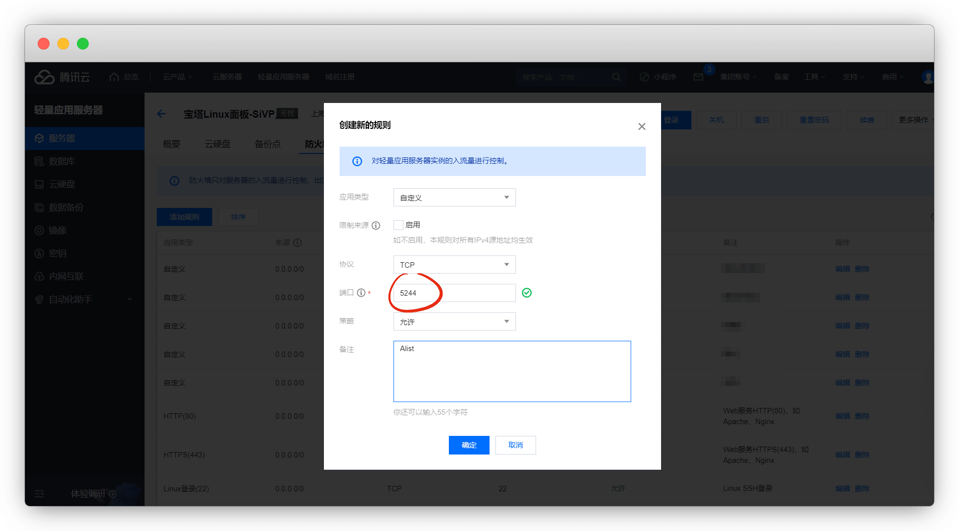 服务器的端口也是需要放行的,以腾讯为例,防火墙 - 添加规则 - 端口:5244 - 确定