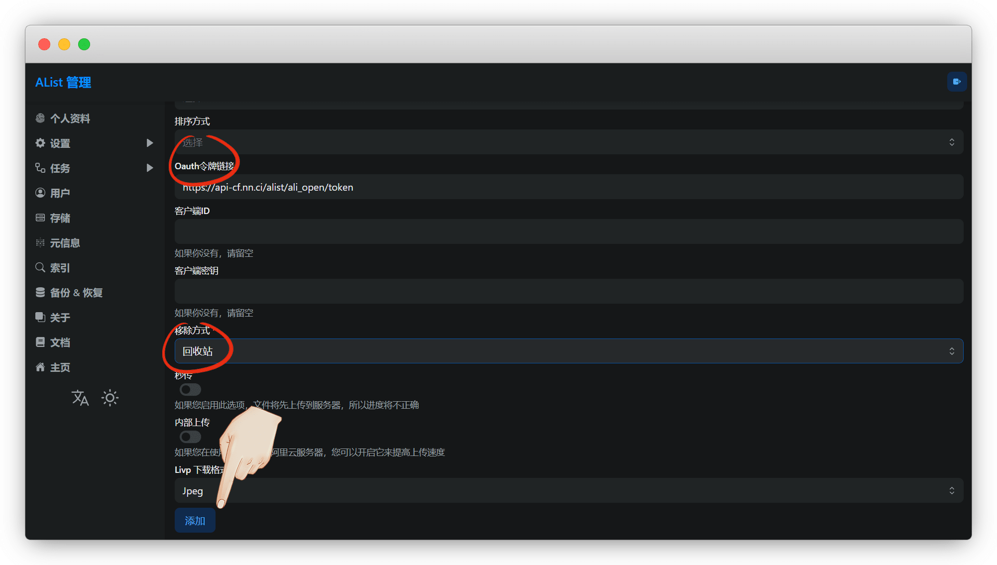 存储 - 添加 - 选择 阿里云盘Open,这里挂载路径填文件夹名,可以自己随便写